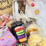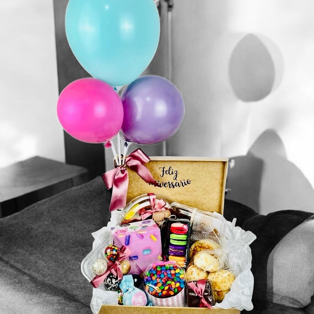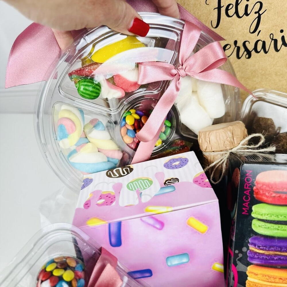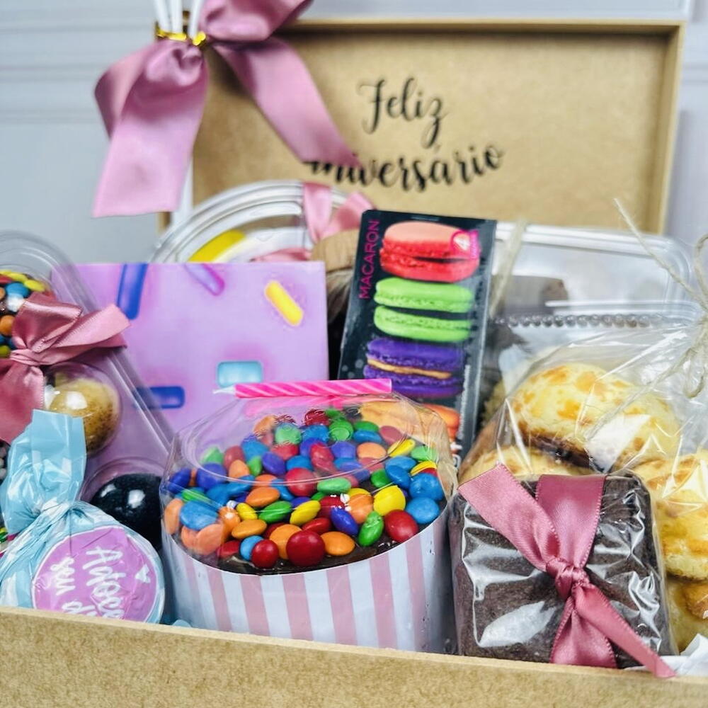 pão de queijo - 1 pcs cartão - 1 pcs trufa - 1 pcs ring donut recheado - 1 pcs brownie gourmet - 1 pcs macarrons ( frutas vermelhas pistachechocolate caramelo c flor de sal) - 4 pcs quiche - 1 pcs palha italiana - 1 pcs caixa de madeira 30x30 - 1 pcs trio de balões - 3 pcs bolo de chocolate com confete - 300 g blister com 6 brigadeiros gourmet - 6 pcs petisqueira com guloseimas finni - 250 g suco de uva ou refrigerante - 1 pcs coxinhas de frango com catupiry - 6 pcs kibe com catupiry - 6 pcs