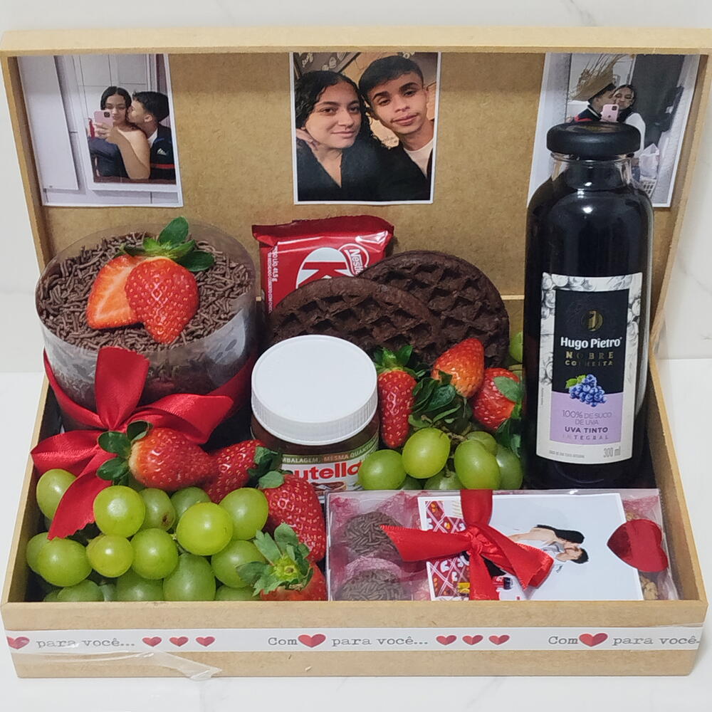cesta - 1 pcs brigadeiros - 8 pcs bentô cake de até 4 fatias - 1 pcs wafles - 2 pcs morangos e uva - 12 pcs fotos polaroid (as fotos devem ser enviadas pelo chat) - 3 pcs kit kat 39 g - 1 pcs nutella peq 140 g - 1 pcs suco (ou bebida da sua preferência - 1 pcs consultar disponibilidade) - 1 pcs