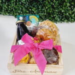 croissant - 1 pcs cesta - 1 pcs laço - 1 pcs geleia - 1 pcs pão de queijo - 1 pcs waffle - 1 pcs caixa de madeira - 1 pcs drip coffee - 1 pcs bolo de cenoura - 1 pcs suco em lata - 1 pcs fruta picada - 1 pcs