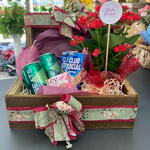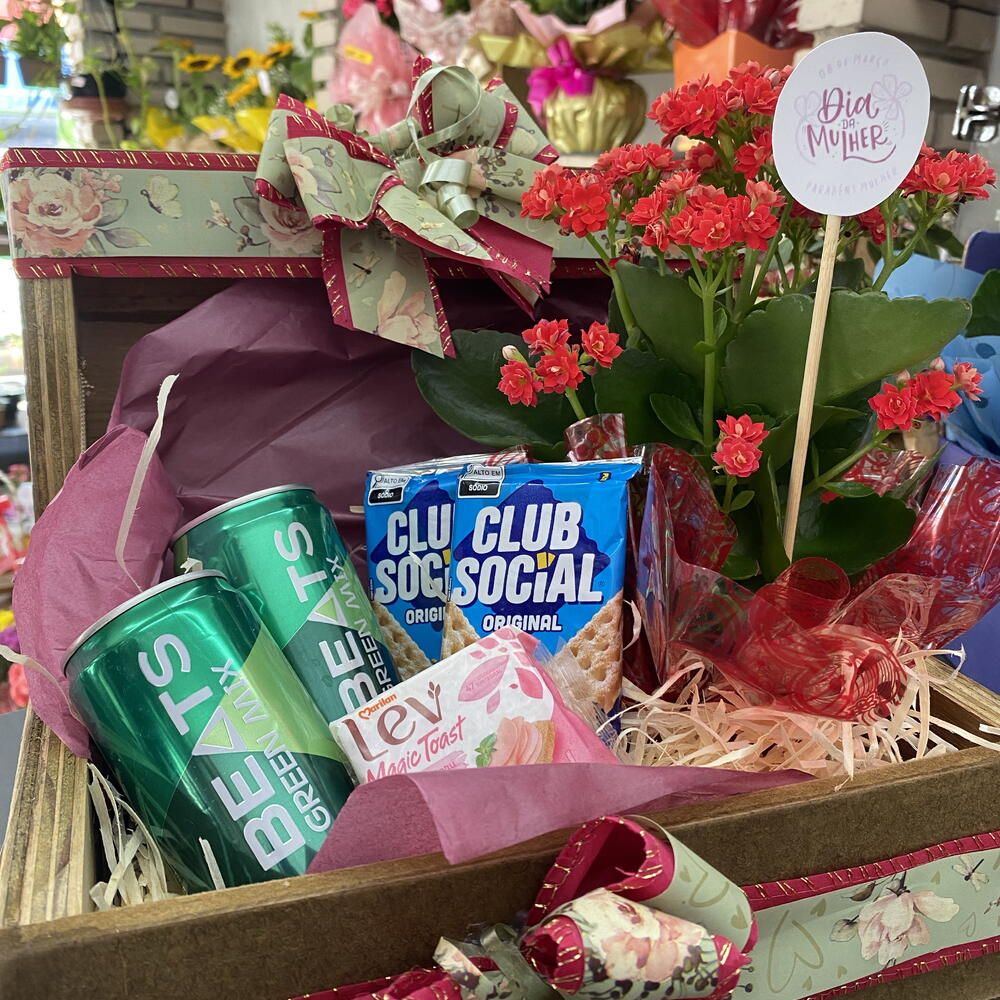 caixa em madeira - 1 pcs arranjo de flor - 1 pcs pacote de biscoito - 3 pcs lata de bebida alcoólica - 2 pcs