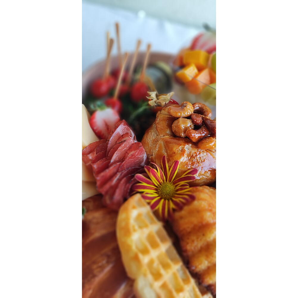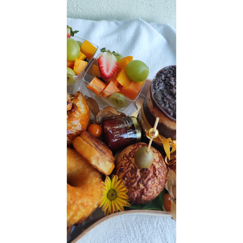 croissant - 1 pcs geleia - 1 pcs salada de frutas - 1 pcs waffle - 1 pcs gouda - 1 pcs bolinho caseiro - 1 pcs copa defumada - 1 pcs espetinho caprese - 1 pcs molho pesto - 1 pcs brie em crosta - 1 pcs naked cake - 1 pcs mini sanduíche de salame - 1 pcs cheese bolls - 1 pcs