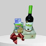 laço - 1 pcs barra de chocolate lindt - 1 pcs embalagem celofane - 1 pcs vinho nacional - 750 ml caixa em pinus - 1 pcs azeitonas sachê - 80 g pote com castanhas - 60 g pote com amendoins tipo japonês - 60 g