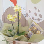 Presenteie alguém especial com este elegante presente de flores e chocolate. O conjunto contém uma encantadora orquídea de duas hastes, meticulosamente arranjada e embalada com cuidado. Também está incluída uma caixa de luxo, perfeita para ocasiões especiais. Para adicionar um toque doce, incluímos uma caixa de deliciosos bombons Ferrero Rocher com 12 unidades. Este conjunto promete tocar o coração e deleitar o paladar.