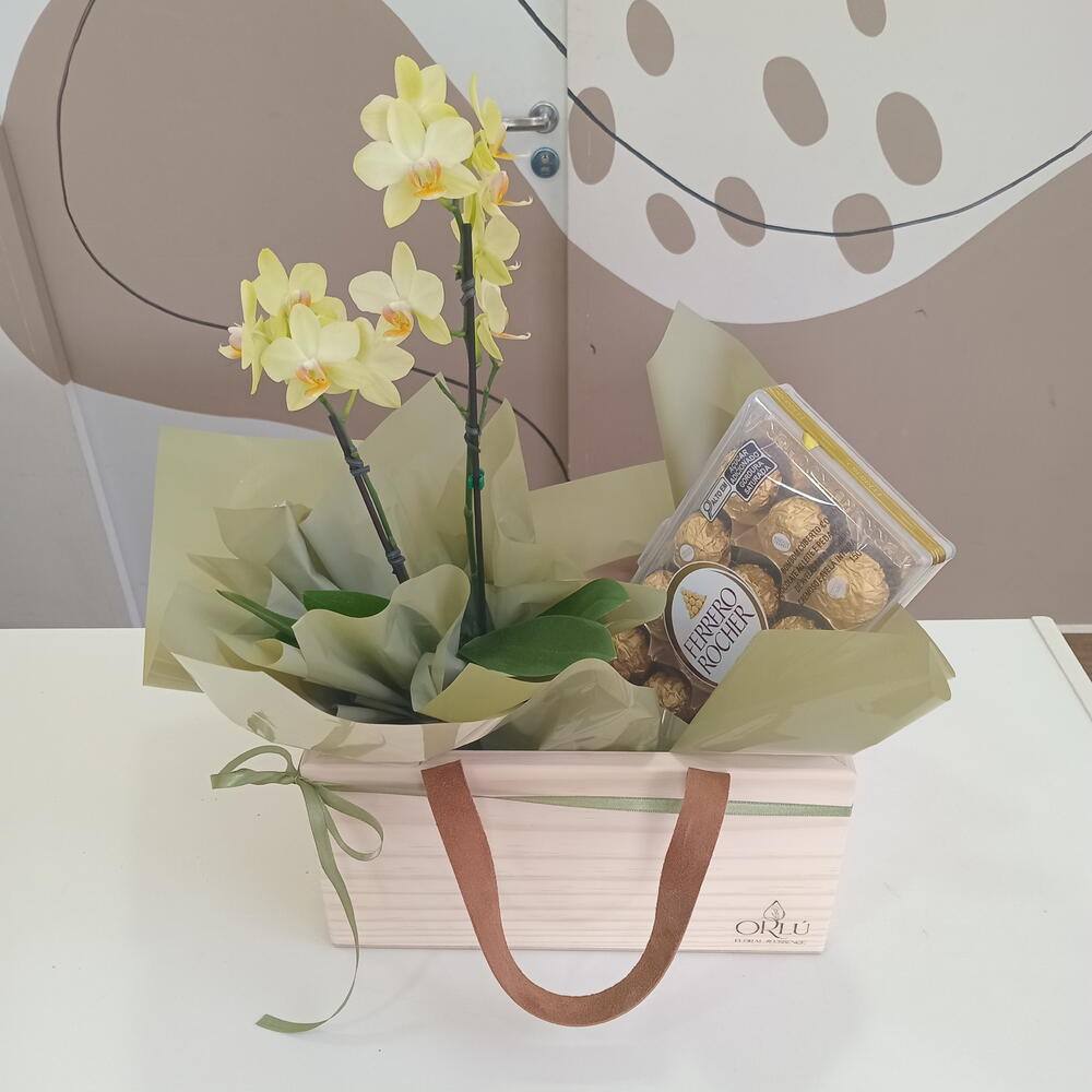 Presenteie alguém especial com este elegante presente de flores e chocolate. O conjunto contém uma encantadora orquídea de duas hastes, meticulosamente arranjada e embalada com cuidado. Também está incluída uma caixa de luxo, perfeita para ocasiões especiais. Para adicionar um toque doce, incluímos uma caixa de deliciosos bombons Ferrero Rocher com 12 unidades. Este conjunto promete tocar o coração e deleitar o paladar.