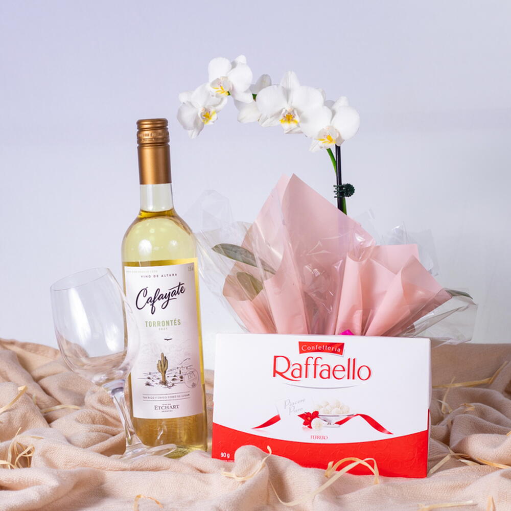 Delicadeza e requinte em perfeita harmonia. Este presente foi pensado para encantar com elegância: uma orquídea Phalaenopsis, símbolo de beleza serena, acompanhada de um vinho branco leve e refinado, ideal para brindar momentos especiais. A taça de vidro valoriza ainda mais a experiência, enquanto os chocolates Raffaello, com sua textura delicada e sabor inconfundível, adicionam um toque doce e irresistível. Uma composição charmosa e atemporal, perfeita para quem aprecia gestos que falam com o coração — e com classe.
