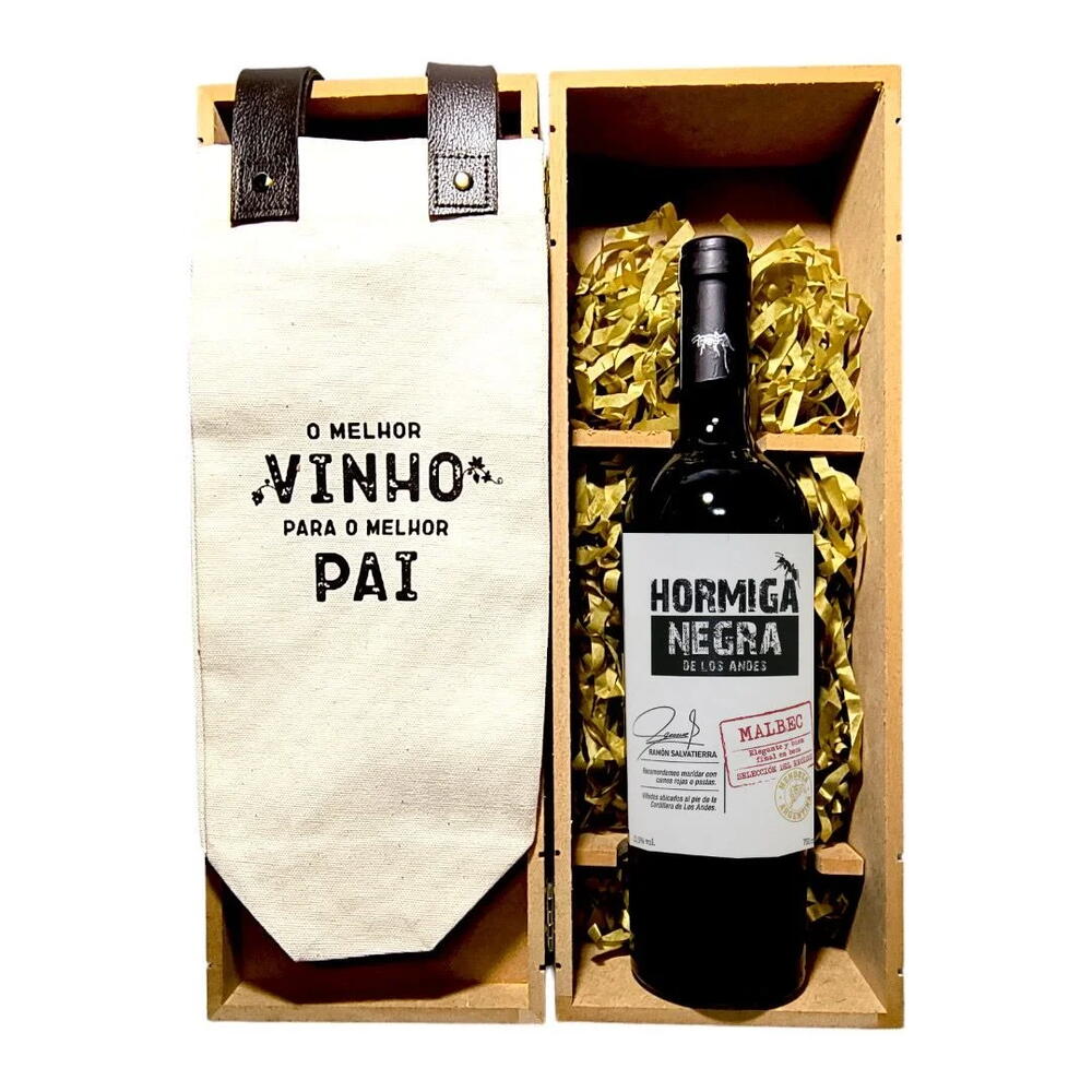 caixa baú mdf - 1 pcs bag para vinho com a frase o melhor vinho para o melhor pai - 1 pcs vinho fino tinto seco hormiga negra malbec argentino 750 ml - 1 pcs celofane + laço - 1 pcs