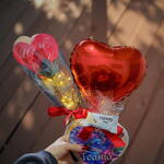 rosa eterna brilhante com fio de fada - 1 pcs coração de acetato com 7 bombons da sua preferência - 1 pcs laço de cetim lindo - 1 pcs balão de coração metálico e a embalagem - 1 pcs
