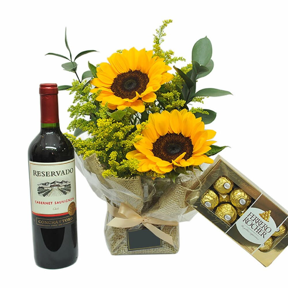 vinho reservado 750ml - 1 pcs lindo arranjo de 2 girassois - 1 pcs caixa ferro rocher 100gr - 1 pcs