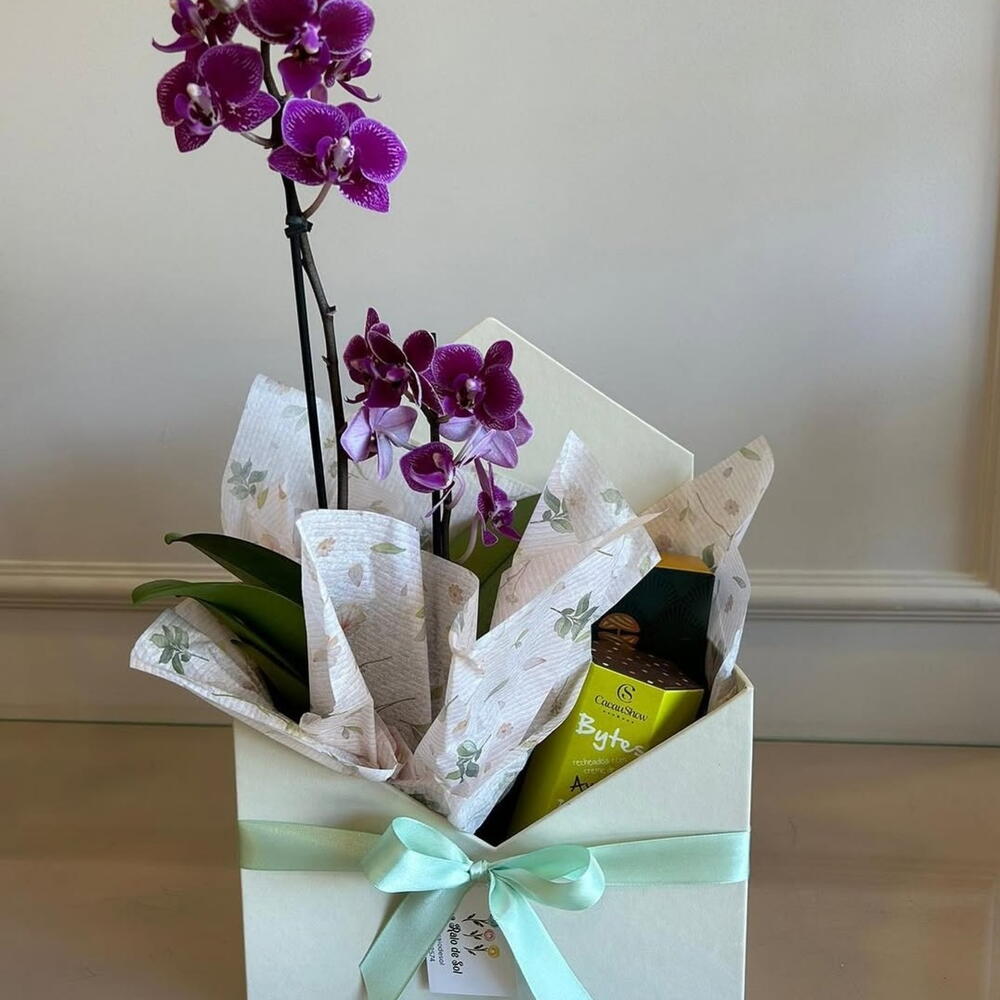 Este maravilhoso conjunto Flores e Chocolate contém um delicioso chocolate em forma de coração, pesando 134g, perfeito para adoçar o paladar. Acompanha também uma magnífica orquídea plantada, lembrando a beleza e a fragilidade dos sentimentos. Tudo isso cuidadosamente arrumado em uma box decorada com um laço charmoso, envolvido por uma embalagem refinada. Um presente que exprime elegância, sofisticação e um toque de doçura.