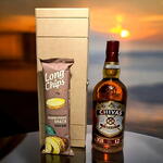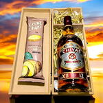 baú em mdf - 1 pcs celofane + laço - 1 pcs whisky chivas regal 12 anos 1 l - 1 pcs batata long chips importada 75 g - 1 pcs
