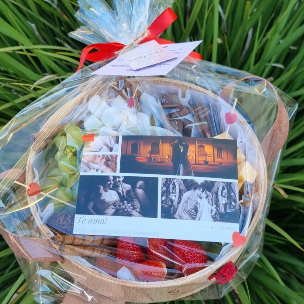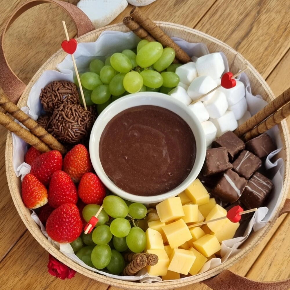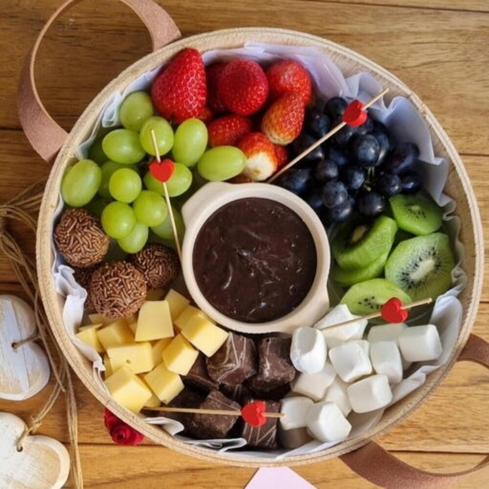 Apaixone-se pelo delicioso mundo dos chocolates com a nossa incrível Cesta de Chocolates. A cesta inclui um kiwi fresco, grandes morangos suculentos, um saboroso queijo Gouda, uvas sem caroço e aveludadas e divertidos marshmallows. Para tornar a experiência ainda mais rica e sublime, incluímos também uma calda de brigadeiro irresistível. Esta Cesta de Chocolate é uma combinação perfeita de sabores exóticos e tradicionais, ideal para surpreender e encantar no café da manhã, lanche ou sobremesa.