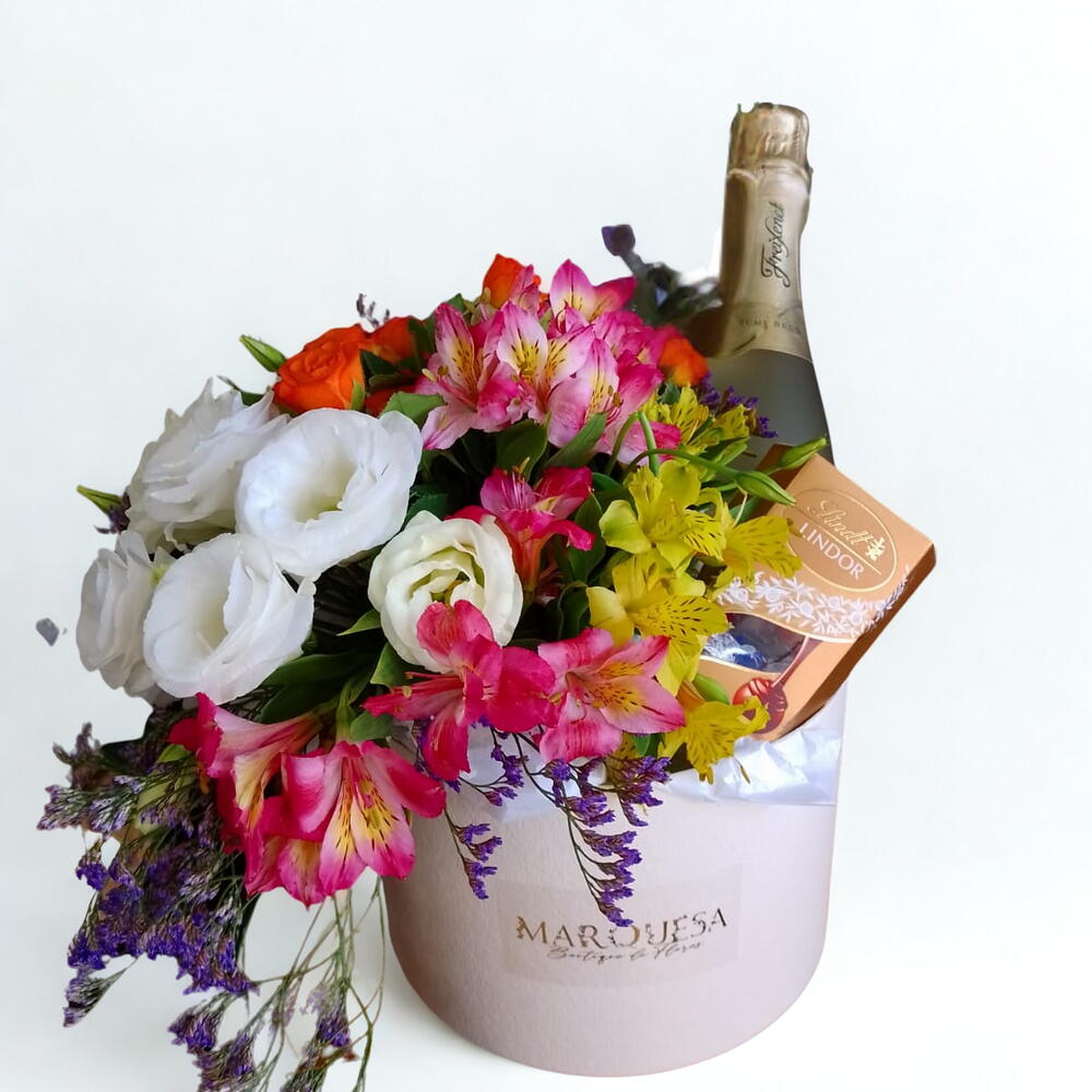 O Lovely Kit é uma expressão de carinho e elegância. A box artesanal é cuidadosamente montada, apresentando um encantador arranjo Lovely que traz a beleza das flores para o momento especial. Acompanhando este presente refinado, um espumante Freixenet Branco acrescenta um toque de celebração, enquanto a caixa de Lindt Assorted oferece uma experiência indulgente de chocolate fino. Este kit é perfeito para expressar sentimentos de apreço, amor ou celebração de uma maneira sofisticada. Surpreenda alguém especial com este conjunto encantador que combina flores, espumante e chocolates de alta qualidade.