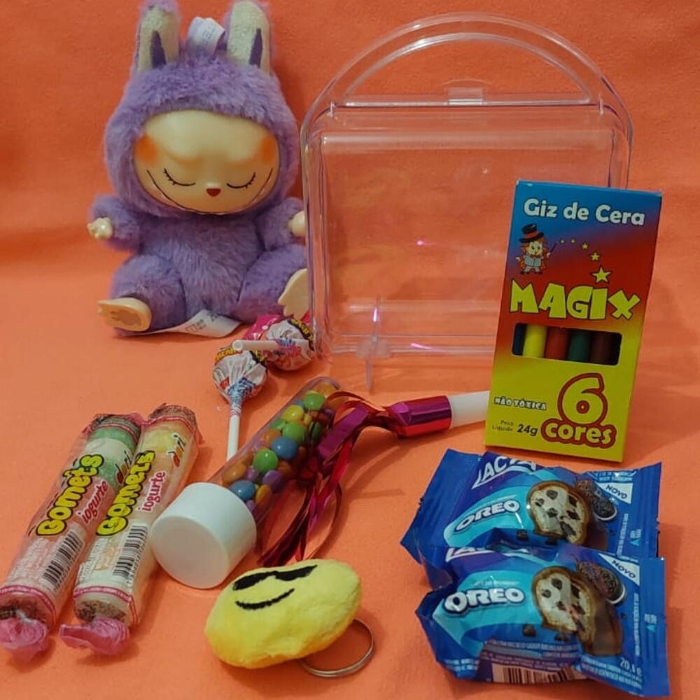 pirulito - 1 pcs giz de cera - 1 pcs tubete com confeitos de chocolate - 1 pcs bombom oreo - 2 pcs balão decorativo - 1 pcs chaveiro emoji - 1 pcs gomet iogurte - 2 pcs apito - 1 pcs maleta acrilica - 1 pcs labubu roxa - 1 pcs