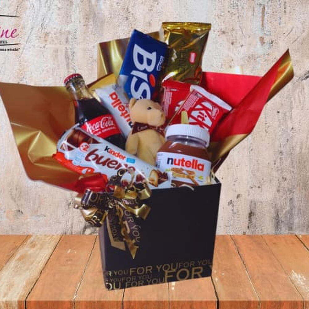 nutella - 1 pcs kit kat - 2 pcs kinder bueno - 1 pcs caixa bis - 1 pcs coca cola - 1 pcs pacote de cookis - 1 pcs nutella b-ready ou yoyo mix - 1 pcs chaveiro ursinho de pelúcia - 1 pcs