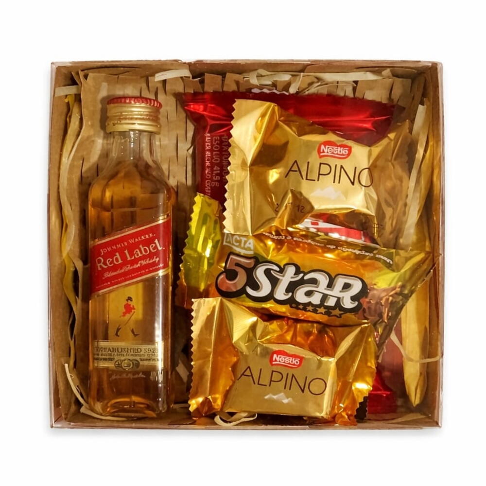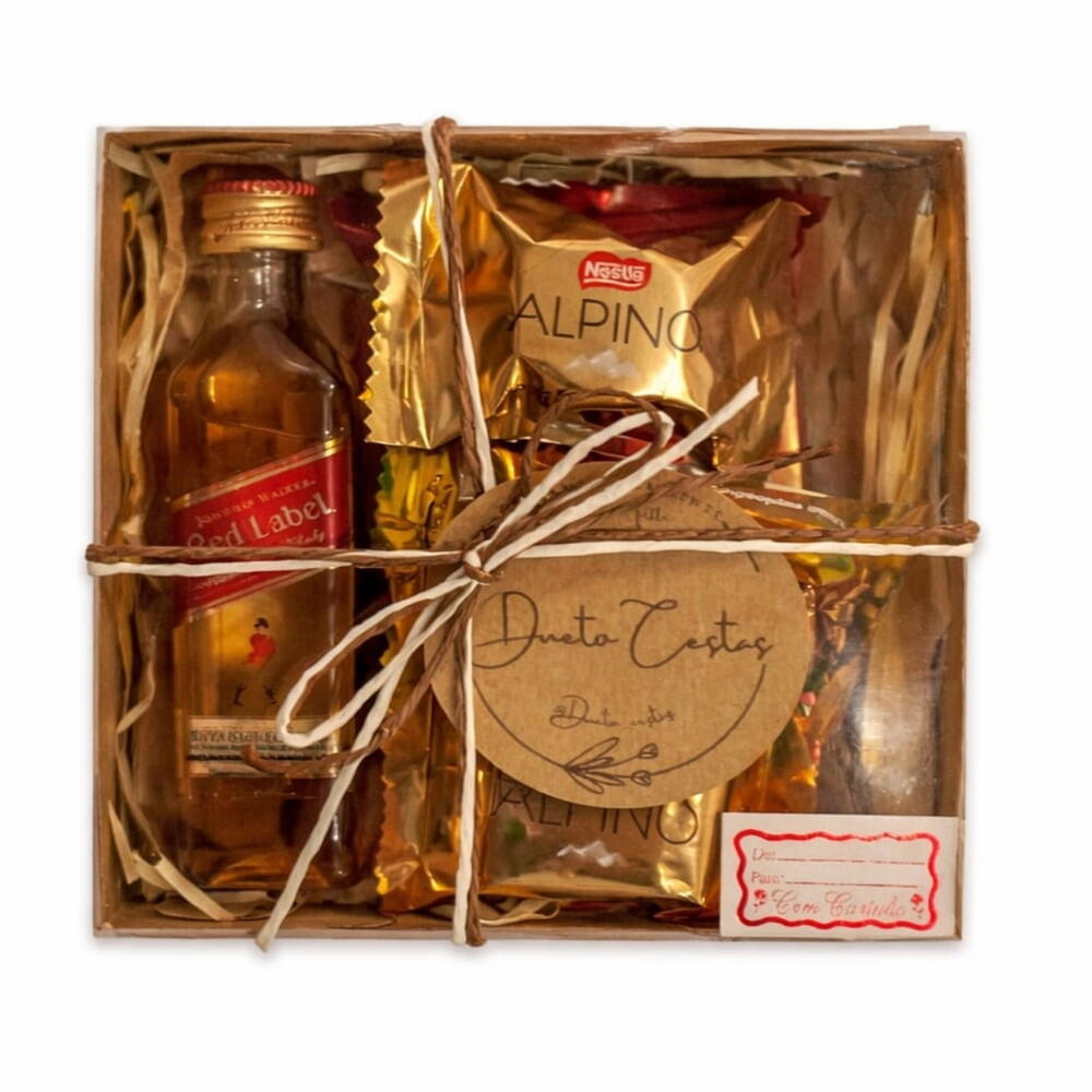 caixa acetado kraft com tampa e laço personalizada - 1 pcs bombom sortido - 3 pcs kit kat original - 1 pcs mini whisky red label - 1 pcs