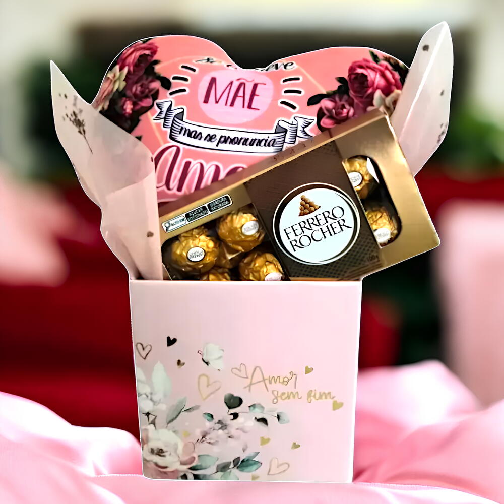 caixa de chocolate ferrero rocher 100g - 1 pcs caixa de catonagem temática. - 1 pcs coração temático com os dizeres se escreve mãe - 1 pcs mas é amor - 1 pcs