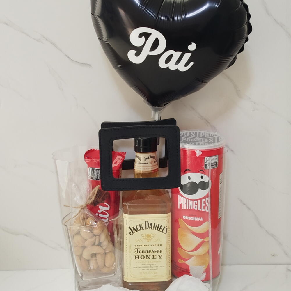 chocolate - 1 pcs copo para whisky - 1 pcs sacolinha decorada - 1 pcs batata pringles original - 1 pcs whisky - 1 pcs
