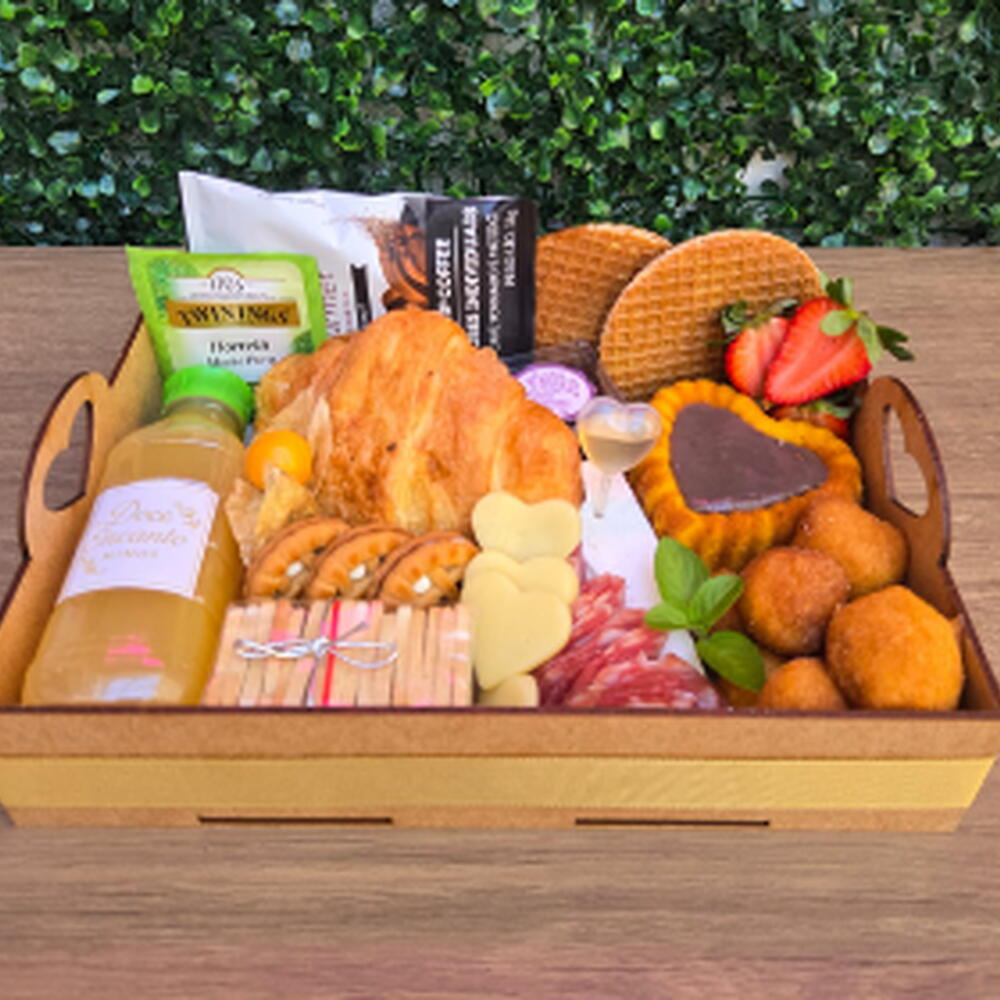 salame - 1 pcs suco de laranja - 1 pcs geléia - 1 pcs chá twings - 1 pcs croissant de presunto e queijo - 1 pcs torrada gourmet - 1 pcs bolo de coração cenoura - 1 pcs biscoito wafel holandês - 2 pcs biscoitos tortinha - 1 pcs queijo briee - 1 pcs bolinho de chuva ou mini donuts - 1 pcs