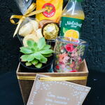 sachê de capuccino - 1 pcs bombom ferrero rocher - 1 pcs mini suculenta - 1 pcs porção de biscoitinhos artesanais - 1 pcs uma caixa em papel rígido com cartão - 1 pcs garrafinha de suco de laranja 180ml - 1 pcs caneca de acrilico - policarbonato - 1 pcs
