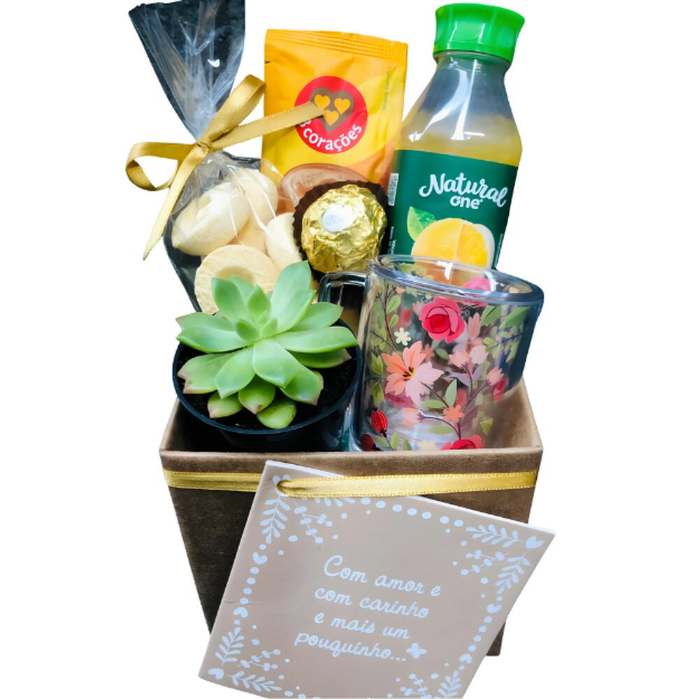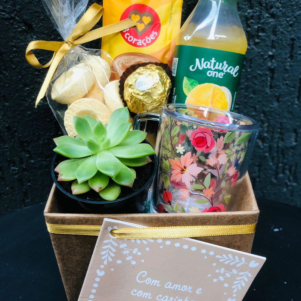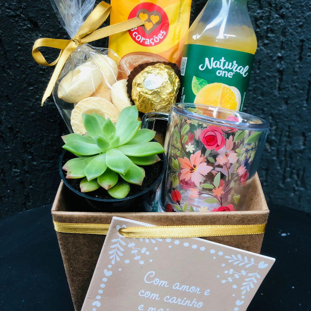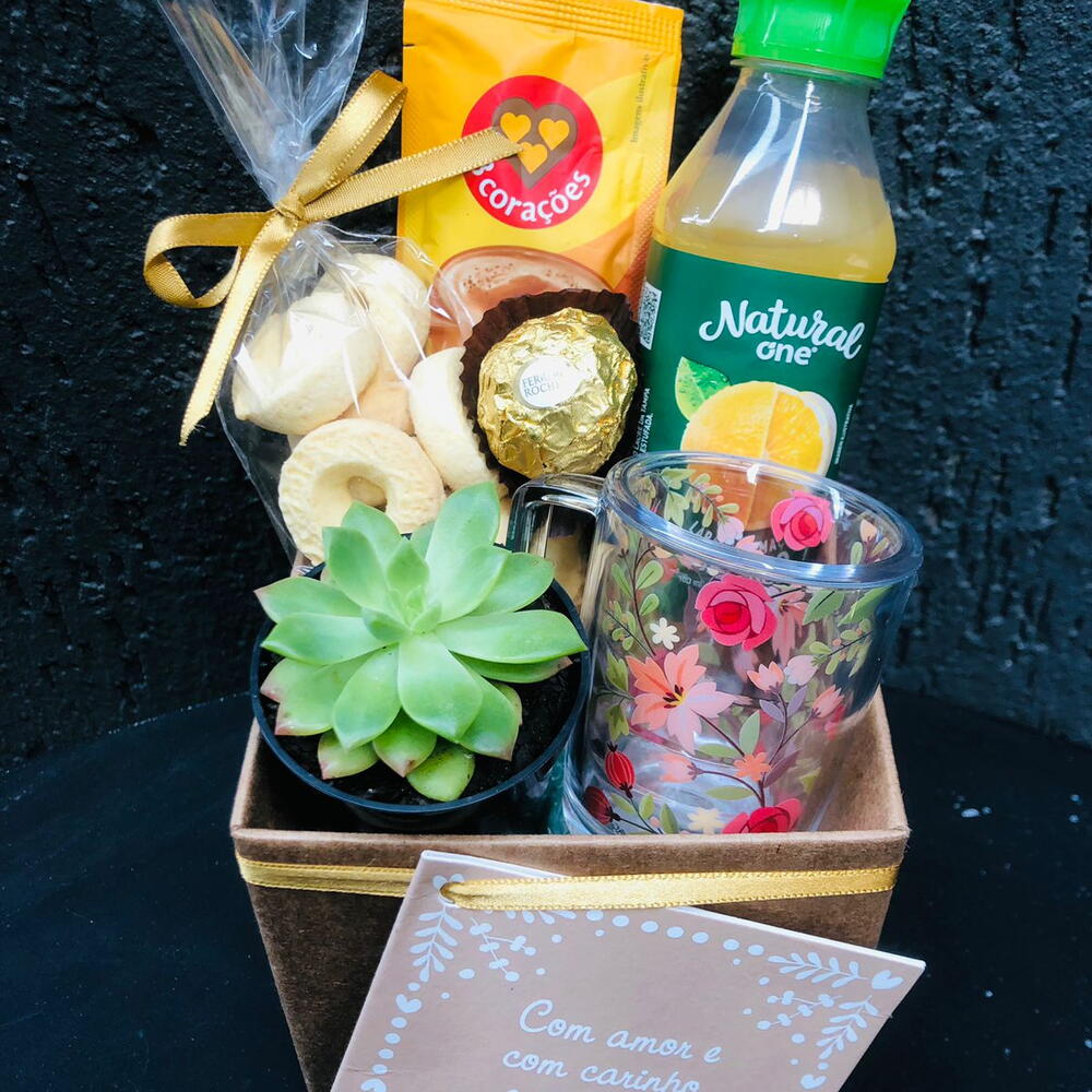 sachê de capuccino - 1 pcs bombom ferrero rocher - 1 pcs mini suculenta - 1 pcs porção de biscoitinhos artesanais - 1 pcs uma caixa em papel rígido com cartão - 1 pcs garrafinha de suco de laranja 180ml - 1 pcs caneca de acrilico - policarbonato - 1 pcs