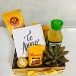 sachê individual de capuccino - 1 pcs mini caixinha em mdf decorada com laço de fita - 1 pcs mini vasinho de suculenta - 1 pcs cartao te amo - 1 pcs mini garrafinha de suco integral de laranja 200ml - 1 pcs um bombom ferrero rocher - 1 pcs dois pacotes individuais de biscoitos bauducco - 1 pcs