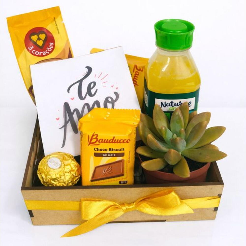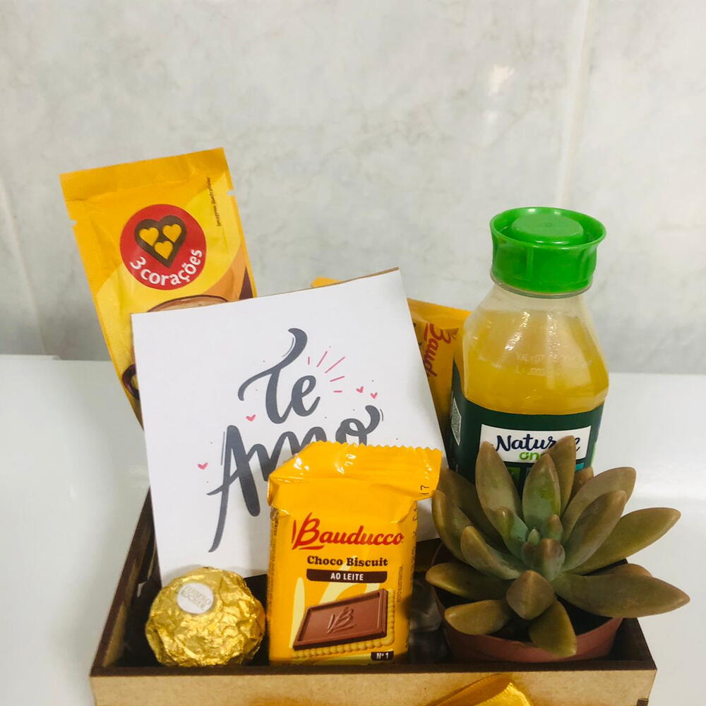 sachê individual de capuccino - 1 pcs mini caixinha em mdf decorada com laço de fita - 1 pcs mini vasinho de suculenta - 1 pcs cartao te amo - 1 pcs mini garrafinha de suco integral de laranja 200ml - 1 pcs um bombom ferrero rocher - 1 pcs dois pacotes individuais de biscoitos bauducco - 1 pcs