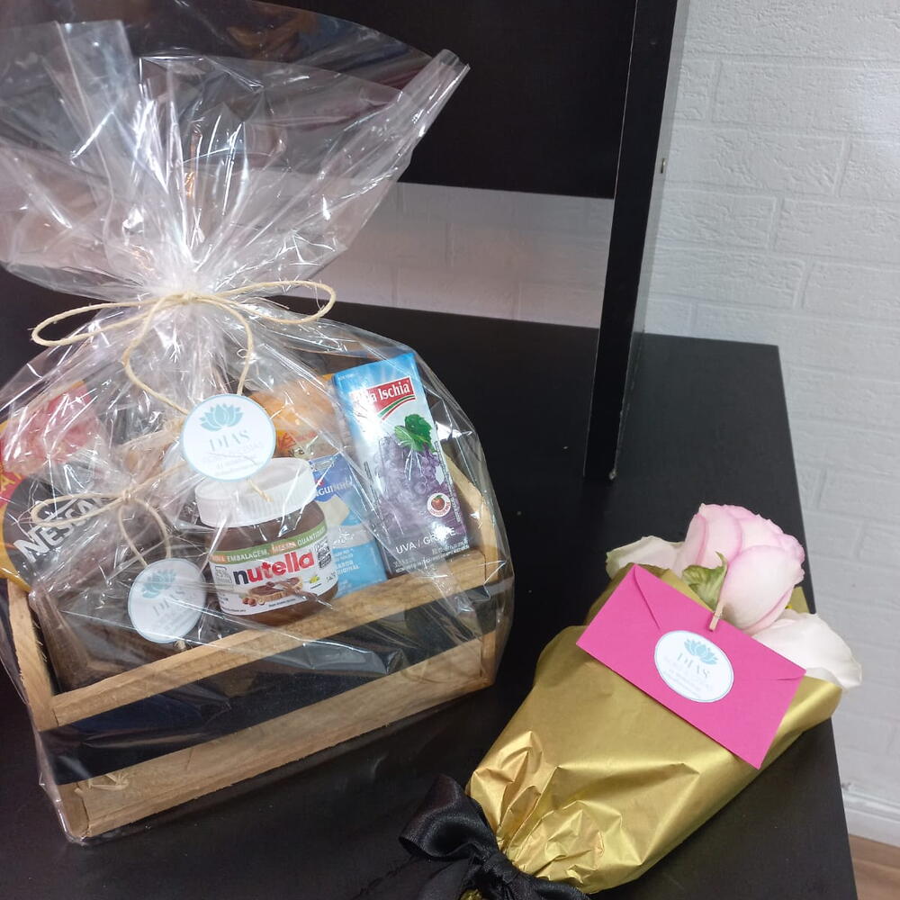 nutella - 1 pcs buquê de rosa - 3 pcs suco - 200 ml biscoito doce - 1 pcs polenguinho - 1 pcs caixa de madeira - 1 pcs embalagem dourada - 1 pcs café soluvel - 1 pcs pão em forma - 1 pcs laço preto - 1 pcs fita preta - 1 pcs
