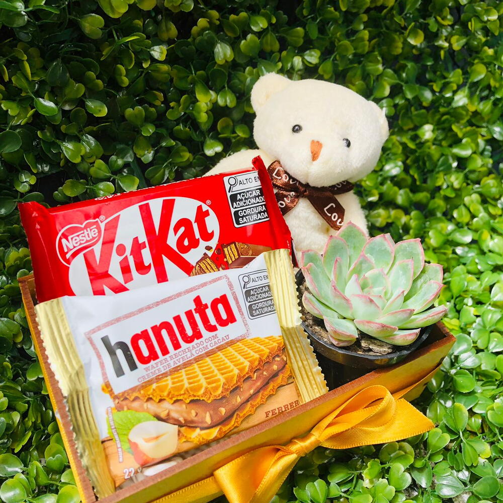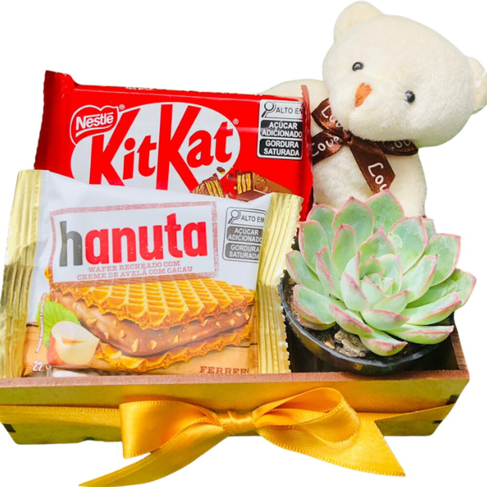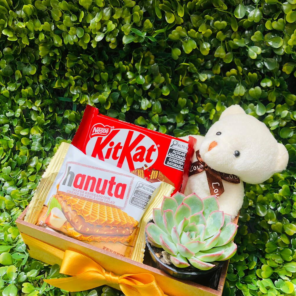 kit kat - 1 pcs mini suculenta - 1 pcs hanuta - 1 pcs mini caixinha em mdf decorada com laço de fita - 1 pcs mini chaveirinho em foramto de ursinho - 1 pcs