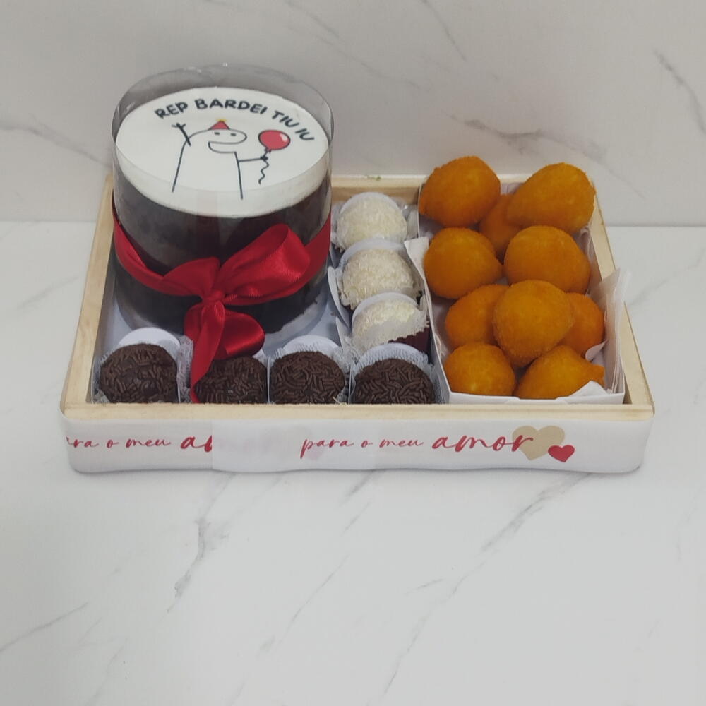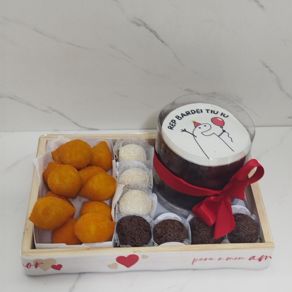 salgadinhos - 12 pcs bandeja - 1 pcs docinhos - 7 pcs laço em cetim - 1 pcs bolo bento cake - 1 pcs