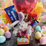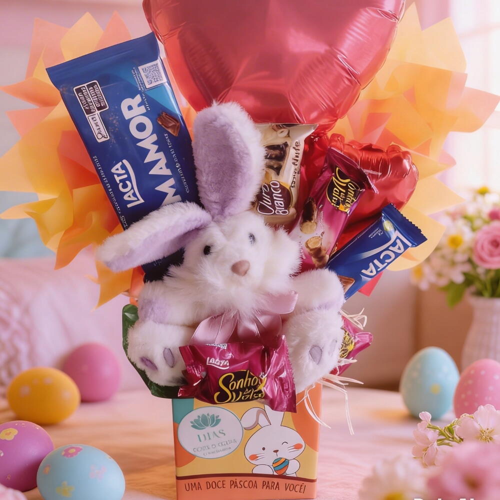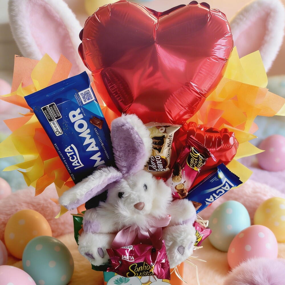 coelho de pelúcia. - 1 pcs barra de chocolate lacta ao leite - 1 pcs sonho da valsa - 2 pcs ouro branco duo nuts - 1 pcs cachepô de papelão decorado - 1 pcs coração metalizado liso - 2 pcs barra de chocolate lacta 20g - 1 pcs