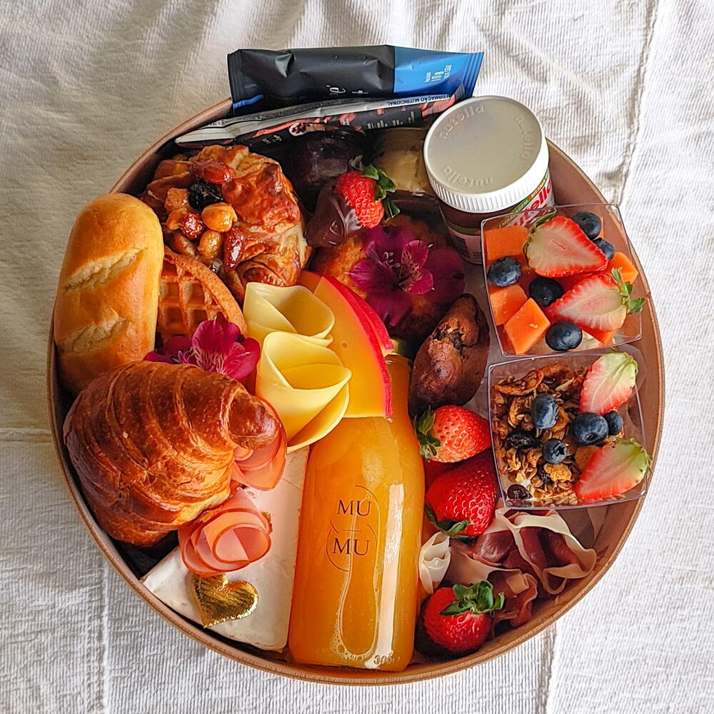 nutella - 1 pcs cookies - 1 pcs manteiga - 1 pcs geleia - 1 pcs suco natural de laranja - 1 pcs croassant - 1 pcs salada de frutas - 1 pcs waffle - 1 pcs pães - 1 pcs drip coffe - 1 pcs mussarela - 1 pcs gouda - 1 pcs brie - 1 pcs caixa personalizada - 1 pcs iogurte com granola - 1 pcs brie em crosta - 1 pcs vanila latte - 1 pcs presunto parma e peito de peru - 1 pcs mini bolo caseiro - 1 pcs morangos cobertos com chocolate - 1 pcs
