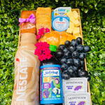 mini croissant - 1 pcs porção de uvas - 1 pcs bebida pronta achocolatada ou a base de café - 1 pcs mini bolinho de laranja - 1 pcs porção de mussarela picada - 1 pcs porção de torradas canapés - 1 pcs base em mdf - 1 pcs blister de geleia individual - 2 pcs blister individual de cream cheese ou requeijão - 1 pcs blister de margarina individual - 1 pcs suco integral de uva 200ml - 1 pcs