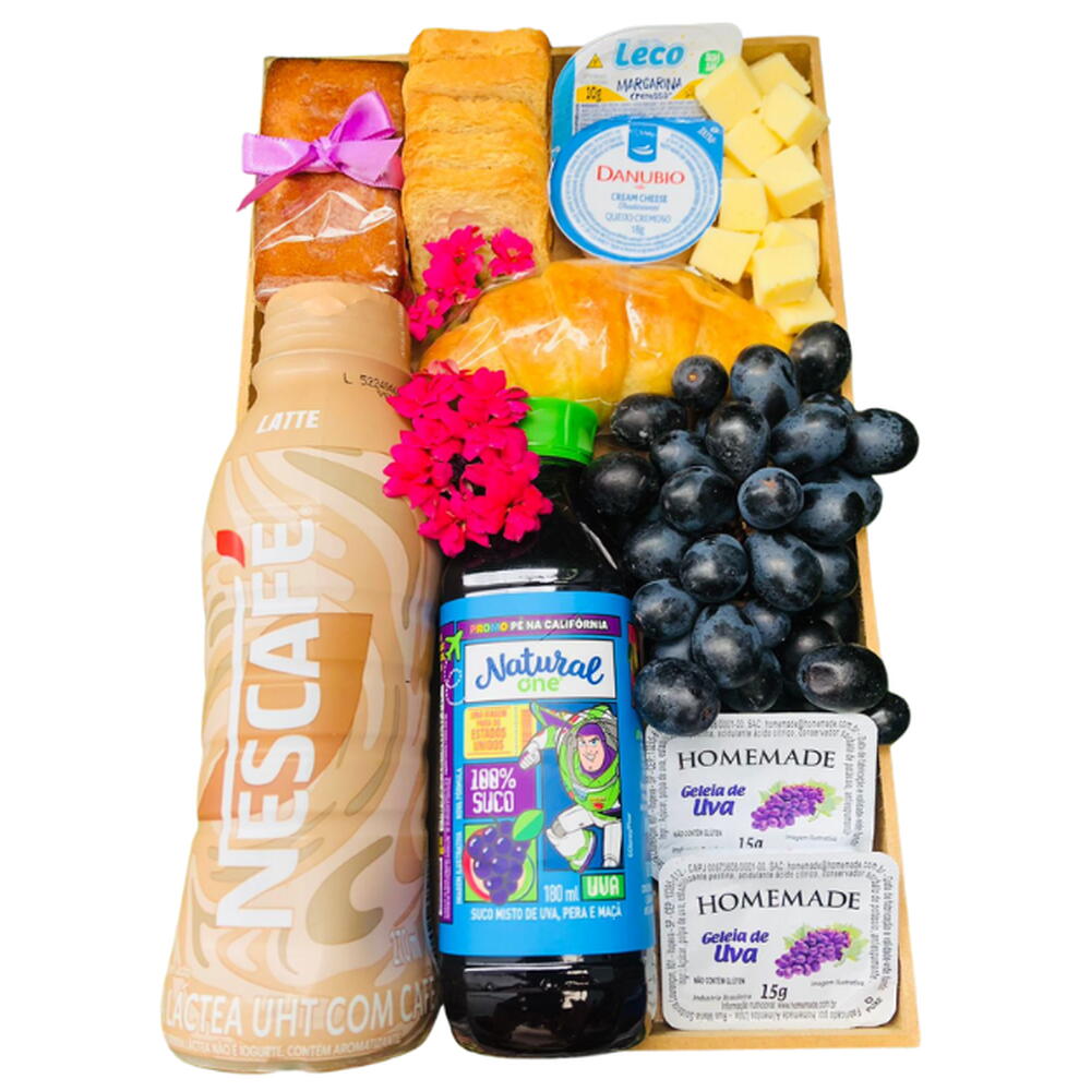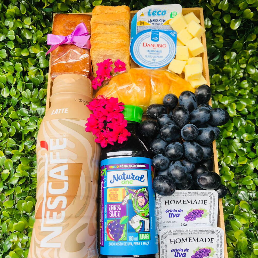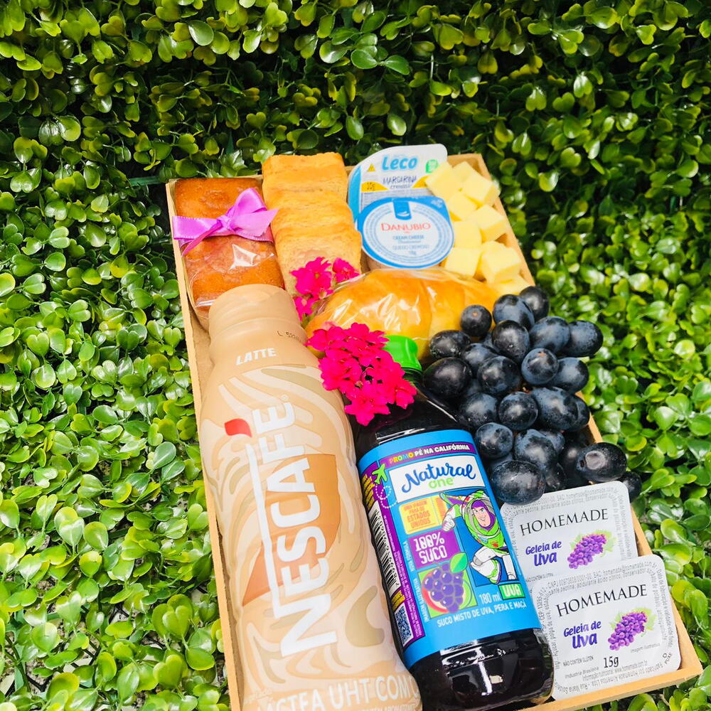 mini croissant - 1 pcs porção de uvas - 1 pcs bebida pronta achocolatada ou a base de café - 1 pcs mini bolinho de laranja - 1 pcs porção de mussarela picada - 1 pcs porção de torradas canapés - 1 pcs base em mdf - 1 pcs blister de geleia individual - 2 pcs blister individual de cream cheese ou requeijão - 1 pcs blister de margarina individual - 1 pcs suco integral de uva 200ml - 1 pcs
