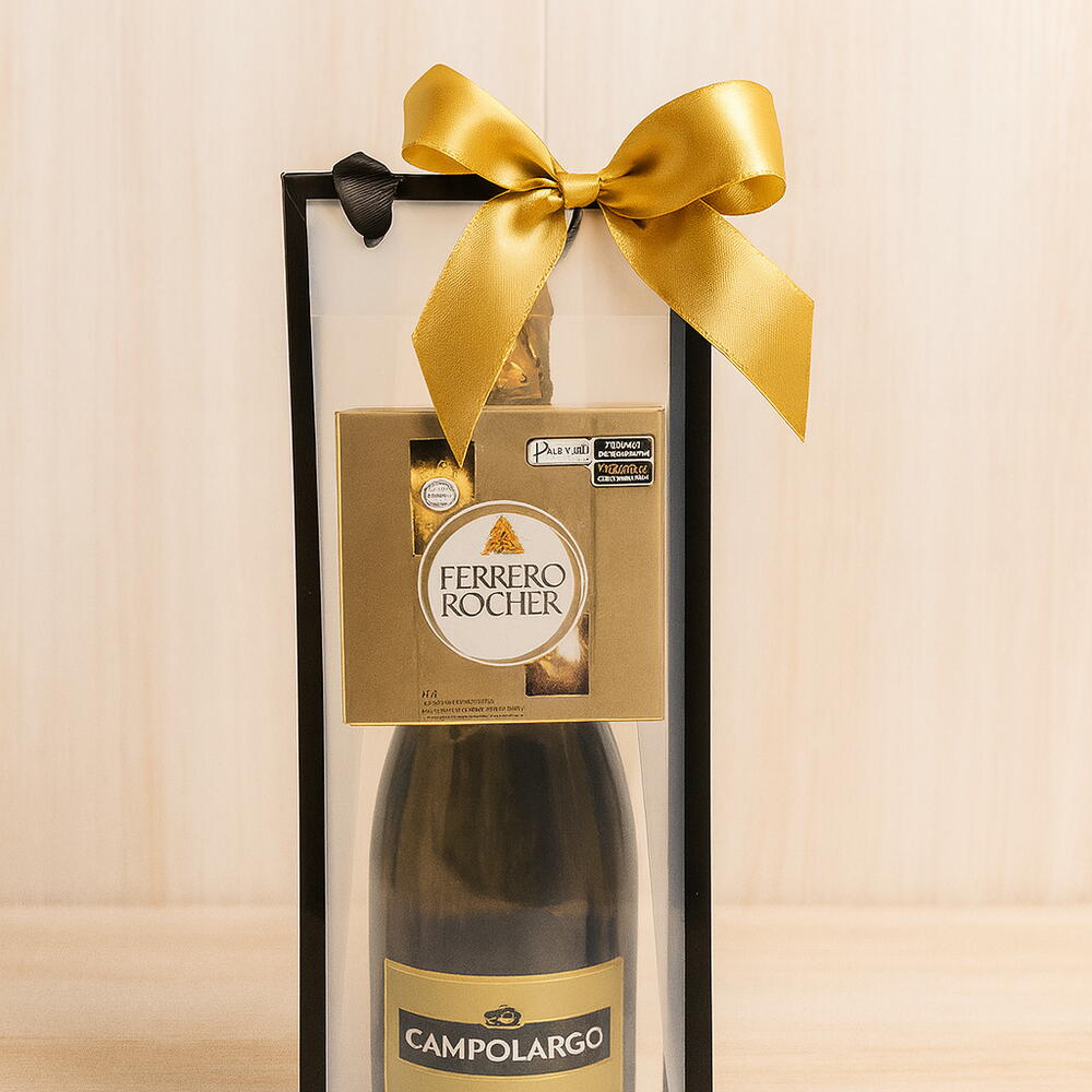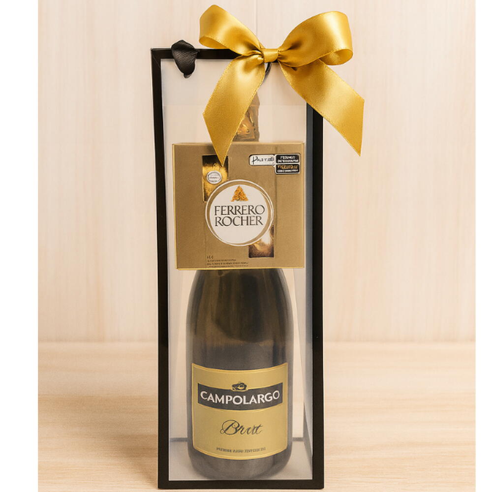 ✨ Presente Premium com Espumante e Ferrero Rocher – Elegância em Cada Detalhe! ✨ Surpreenda com um presente que combina sofisticação, sabor e charme! Este kit exclusivo acompanha um espumante Campo Largo Brut, perfeito para brindar momentos especiais, acomodado em uma sacolinha transparente premium, que valoriza ainda mais o visual do presente. Para completar a experiência, um delicioso Ferrero Rocher com 4 unidades, trazendo o toque irresistível do chocolate mais amado do mundo. Finalizado com laço dourado e preto, este presente transmite luxo e bom gosto, sendo ideal para aniversários, agradecimentos, celebrações corporativas, gestos de carinho e ocasiões especiais. 🎁 Um presente elegante, prático e inesquecível — pronto para encantar quem você ama!