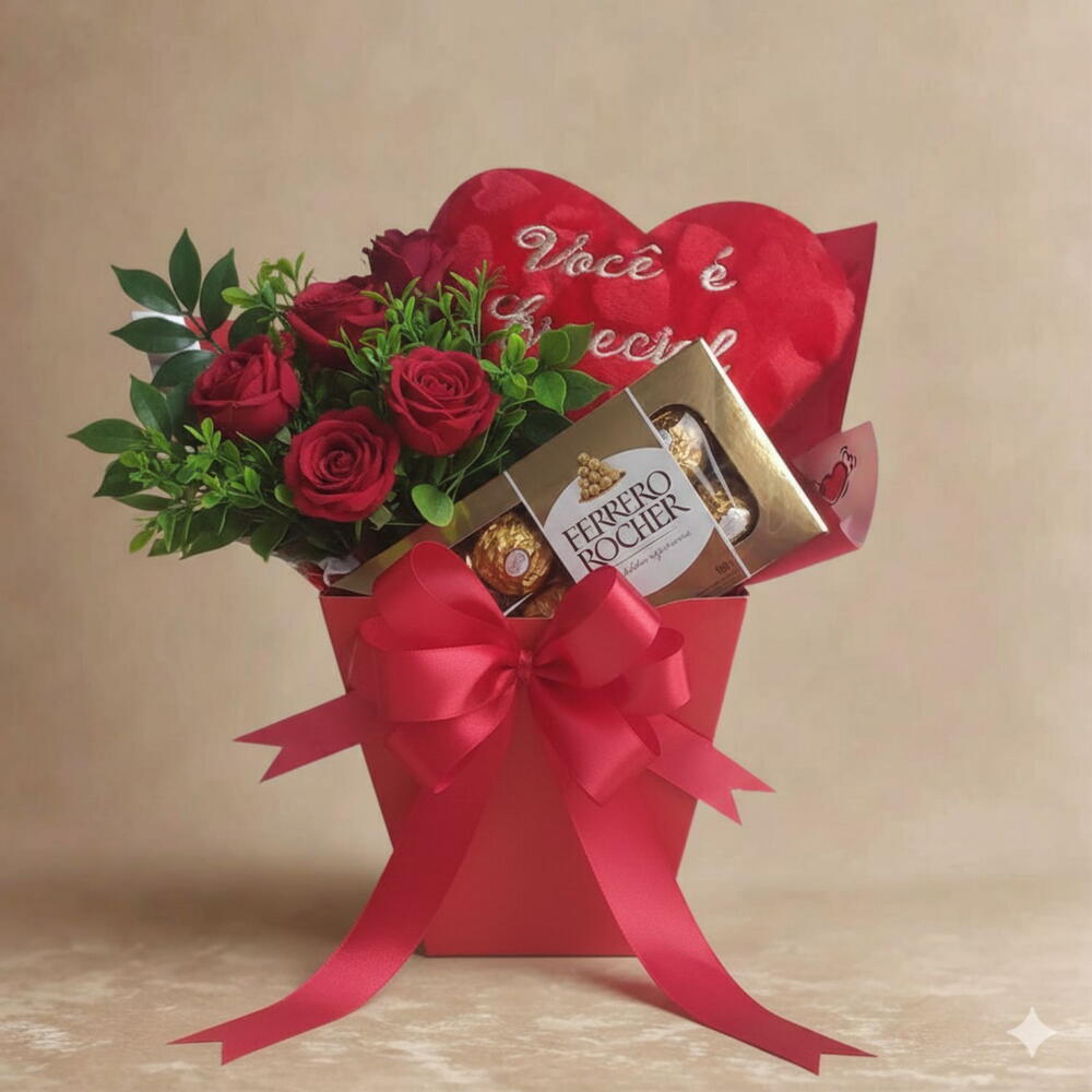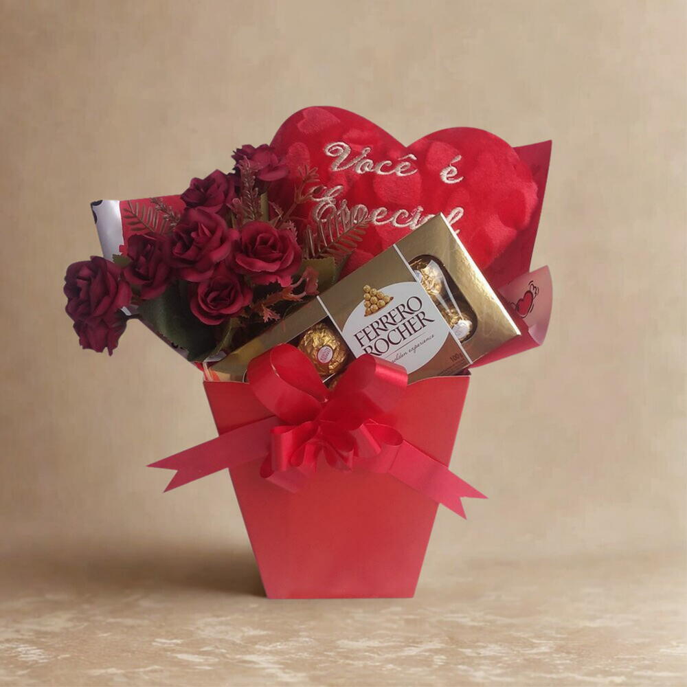 Presenteie alguém especial com esta encantadora combinação de flores e chocolate. Este conjunto inclui uma caixa Ferrero Rocher de 100g, repleta de chocolates indulgentes para satisfazer o paladar. Junto com o chocolate, você encontrará uma almofada de coração com uma frase romântica, perfeita para expressar sentimentos profundos sem palavras. Adicionamos a este pacote um irresistível buquê de flores, selecionado para encantar e surpreender. Tudo isso vem embalado de forma elegante em uma caixa de cartonagem temática Love. É o presente perfeito para aquele alguém especial.