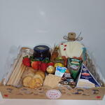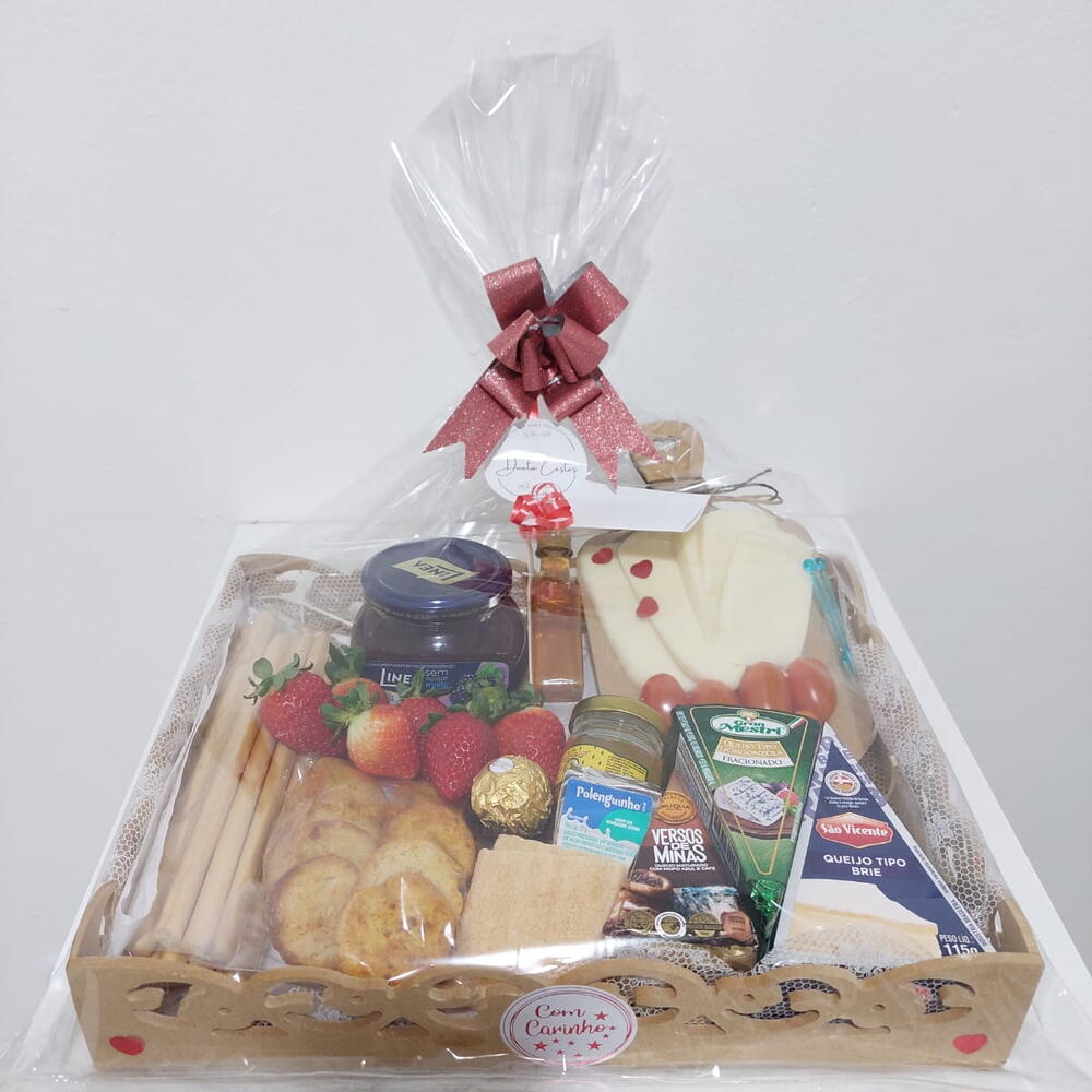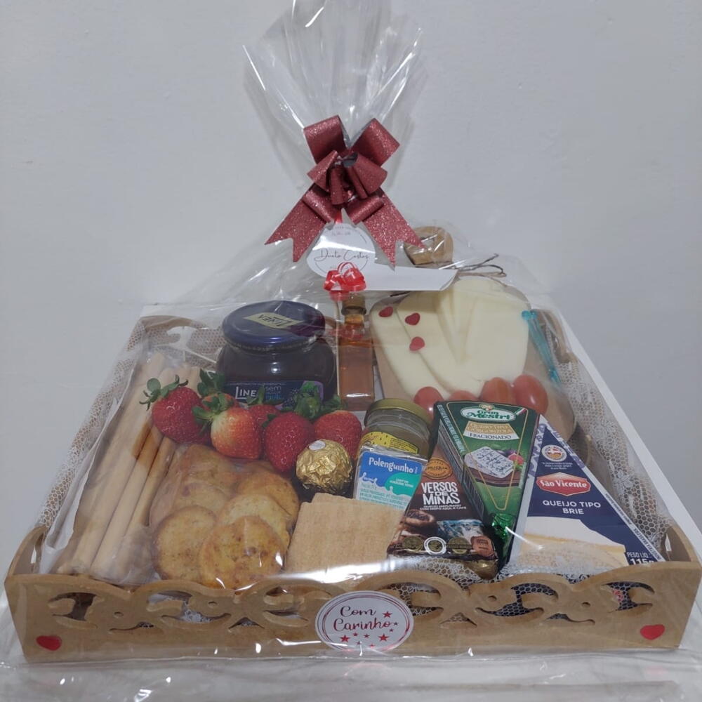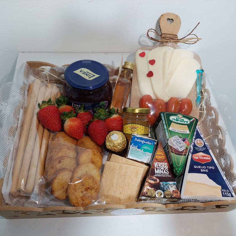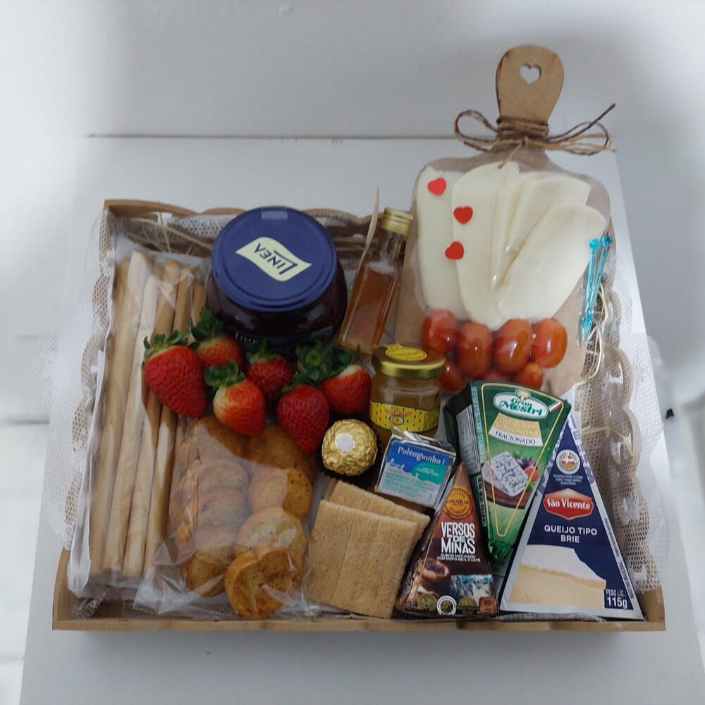 queijo brie - 1 pcs queijo mussarela fatiado - 4 pcs queijo gorgonzala - 1 pcs queijo minas - 1 pcs tomate cereja - 4 pcs polenguinho; - 1 pcs crackers - 3 pcs mel (porção mini vidro) - 1 pcs mini tabua - 1 pcs torradas - 6 pcs morango fresco - 6 pcs palitos assados de parmesão - 10 pcs geleia peq - 1 pcs ferrero 1un - 1 pcs geleia grande - 1 pcs
