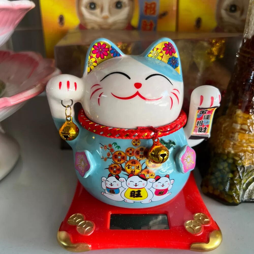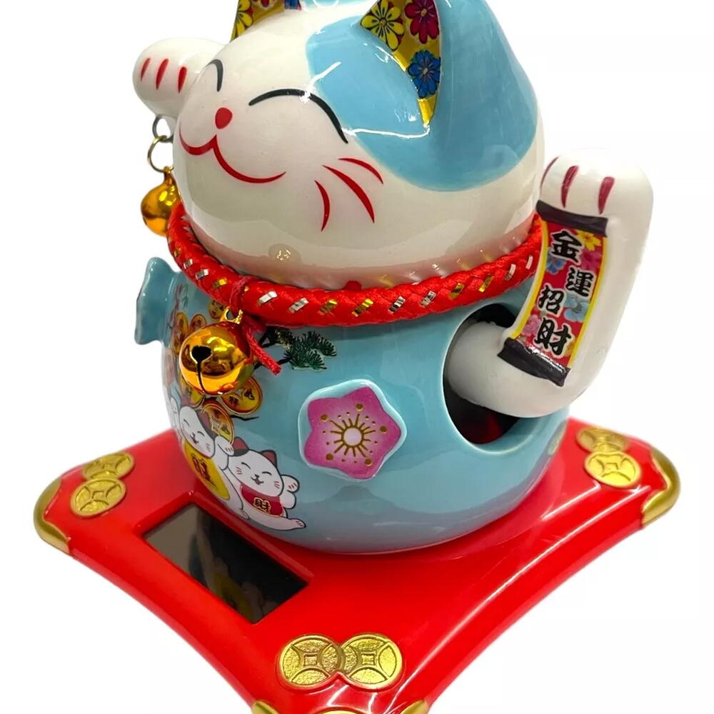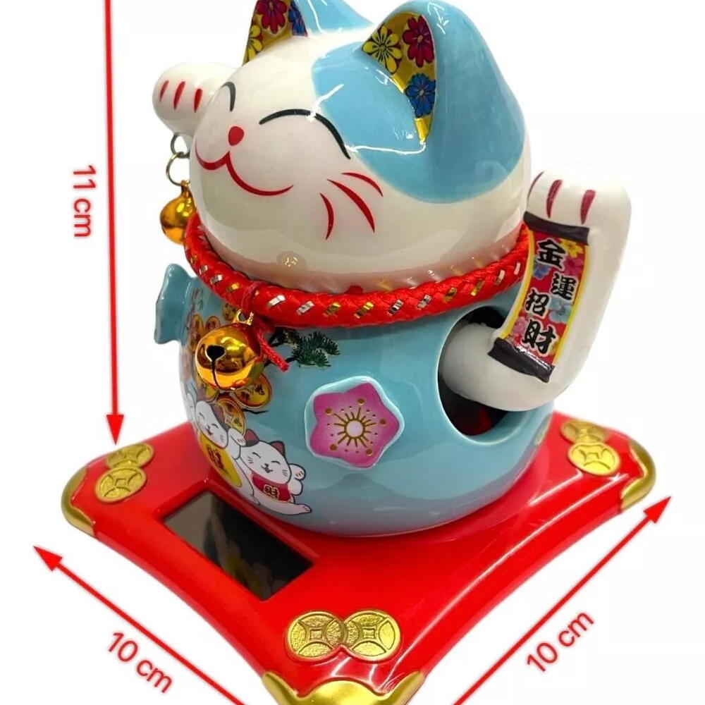 O Manekineko é uma figura amplamente conhecida, como um gato afortunado que acena para a sorte e felicidade. Uma antiga lenda japonesa conta que uma idosa, dona de uma estalagem, possuía um gato que todas as manhãs se espreguiçava na frente do estabelecimento. Para os viajantes, o ato do gato limpar os olhos com a pata significava um convite, como se ele estivesse acenando para eles. Assim, o gatinho tornou-se um símbolo ideal para trazer sorte e energia positiva para pessoas queridas e para os estabelecimentos comerciais. Funciona através de energia solar, acenando com mão esquerda. Muitas pessoas decoram sua casa ou estabelecimento comercial com o Gato da Sorte para atrair prosperidade nós negócios. Peso: 230 gramas Dimensões do Produto em cm (L x A) : 10 cm x 11 cm