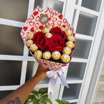 Buquê em formato de coração com 17 chocolates Ferrero Rocher e 3 rosas artificiais aveludadas, montado em embalagem premium para presente. Informações importantes: • Embalagem pode variar conforme estoque • Todos os buquês acompanham proteção transparente - Envie os dizeres do bilhete no chat (bilhete impresso com envelope branco) Presente ideal para Valentine’s Day, Dia dos Namorados, Dia das Mães, Dia Internacional da Mulher, aniversários, pedidos de desculpas e datas especiais. Uma opção criativa para quem deseja sair do tradicional de floricultura, flores e cestas de café da manhã ou cesta de chocolate.
