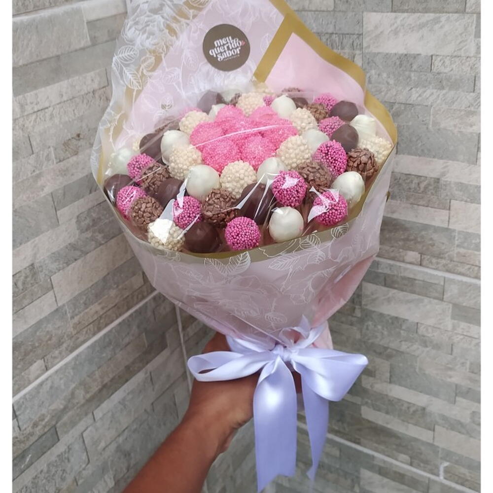 Buquê com 63 uvas banhadas em chocolate (branco, preto ou misto), granulado vermelho, rosa ou azul, em embalagem premium.
