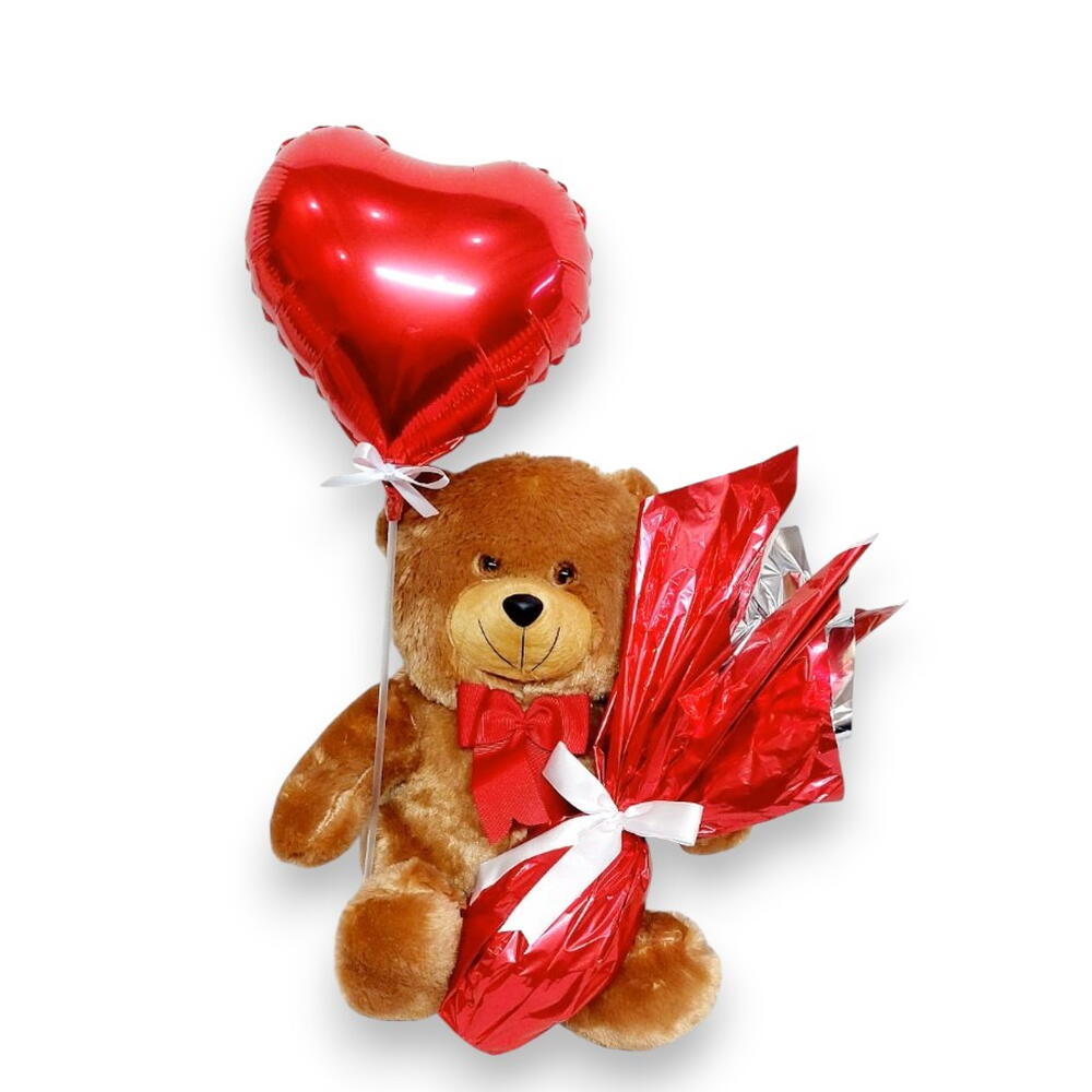 1 Delicioso ovo 250g ao leite artesanal feito com chocolate nobre (garoto) 1 Linda pelúcia de ursinho Ted 1 Lindo Balão