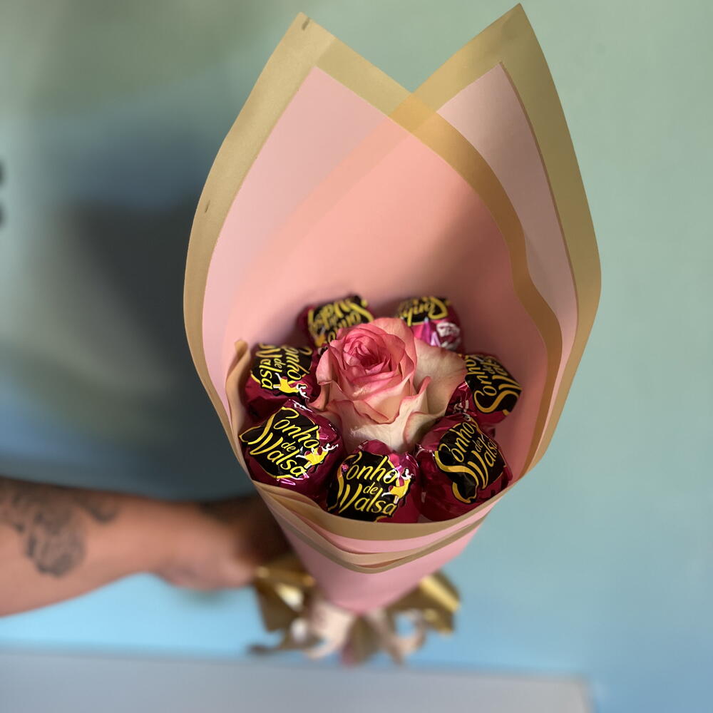 Encante quem você ama com este requintado buquê. Consiste em sete sonhos de valsa, cuidadosamente organizados em torno de uma única rosa, o símbolo do amor eterno. Esse arranjo exquisito é cuidadosamente embalado em uma embalagem moderna e finalizado com um laço delicado. Ideal para demonstrar seu afeto em um aniversário, dia dos namorados ou qualquer ocasião especial.
