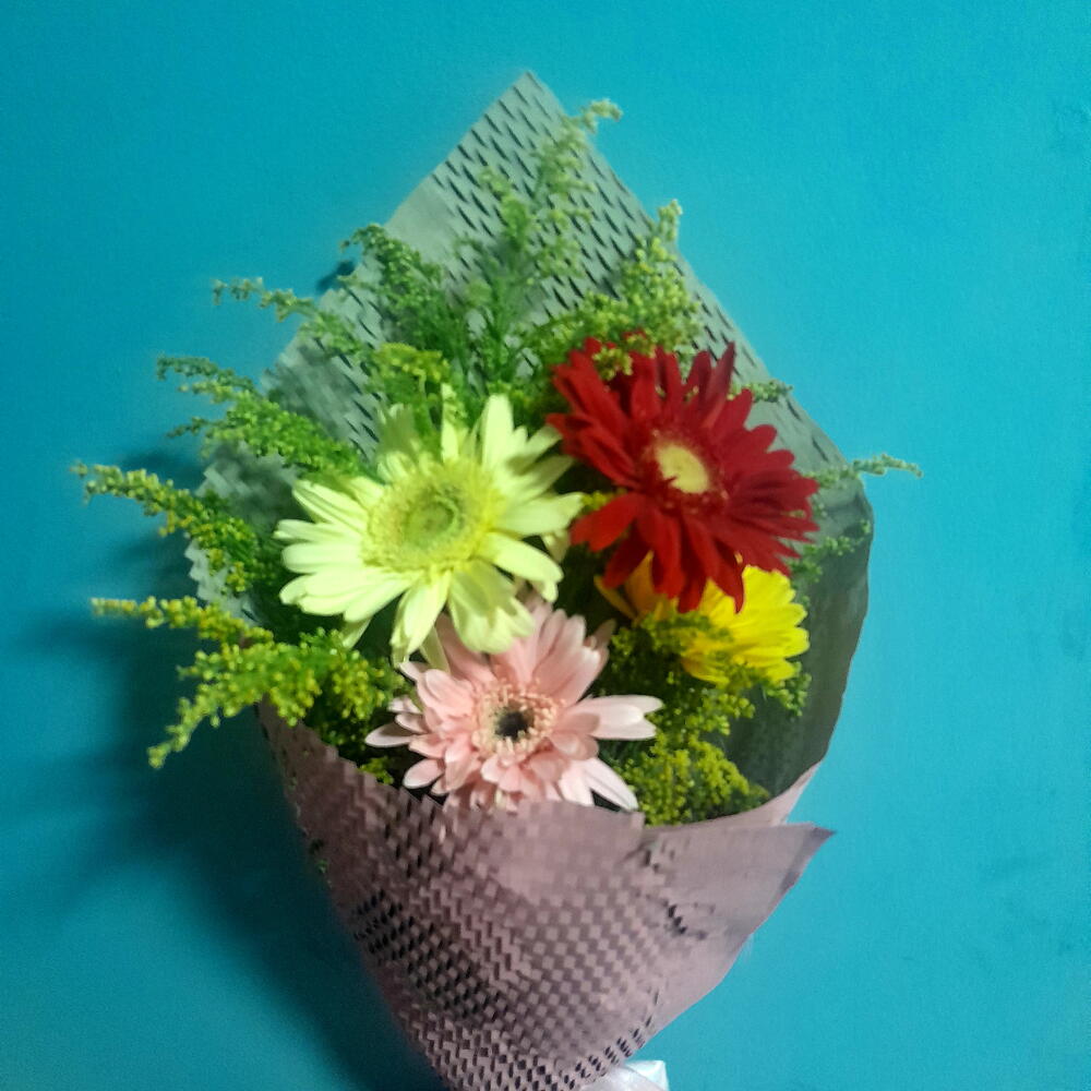 folhagem - 4 pcs gerberas coloridas - 4 pcs tango ou gypsophilla de acordo com disponíveis - 4 pcs embalagem (que combine com a tonalidade das flores e tag - 1 pcs