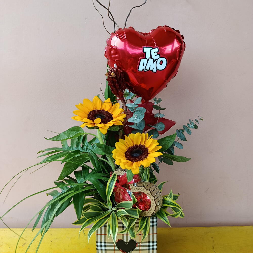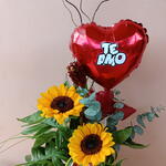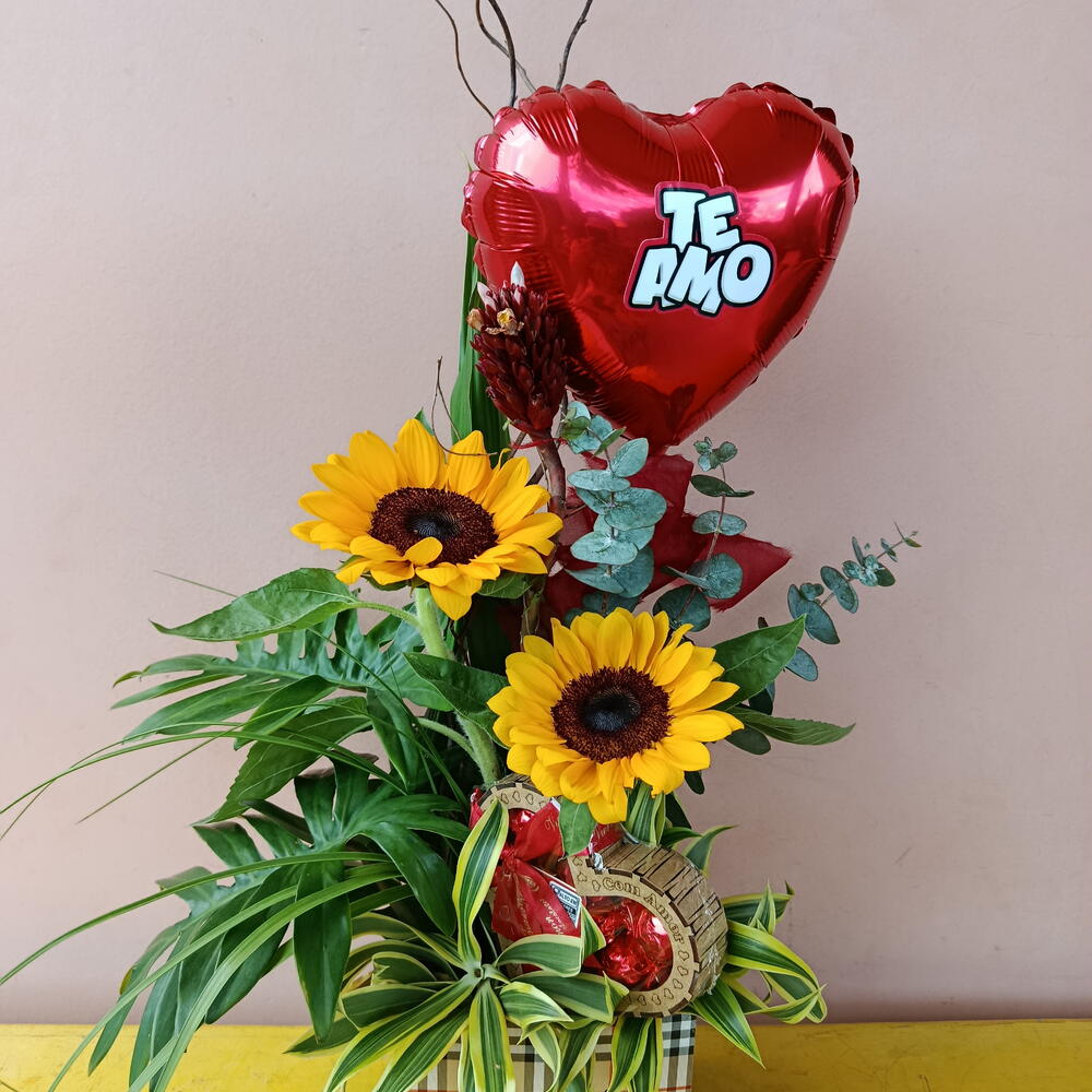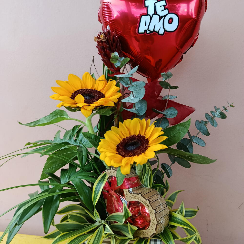 Este maravilhoso presente vem encantadoramente embalado e inclui dois girassóis vibrantes, uma caixa de finos chocolates Viermon MDF 07 e um balão de coração com a doce declaração Eu te amo. Este é o presente perfeito para expressar seus sentimentos para alguém especial em qualquer ocasião.