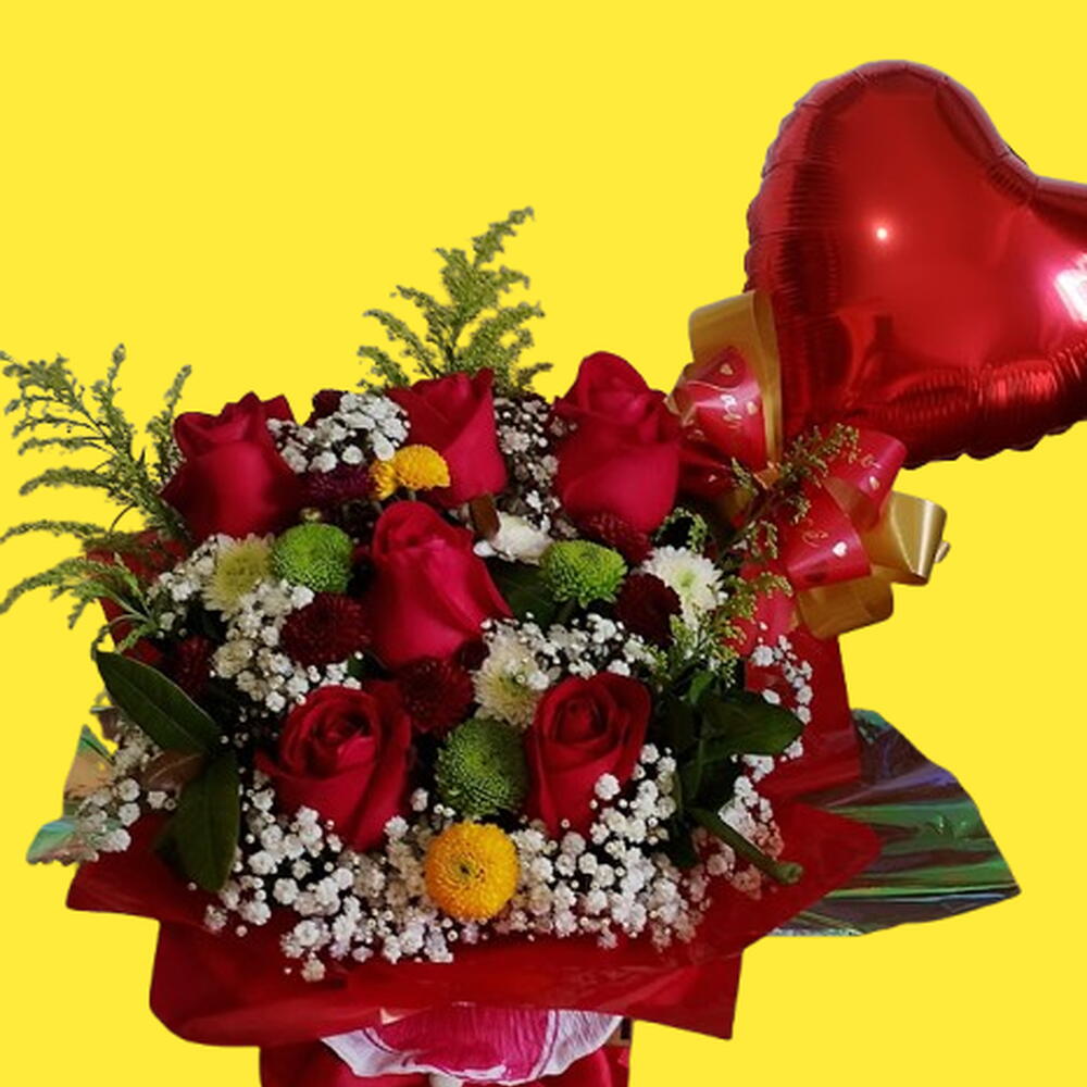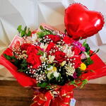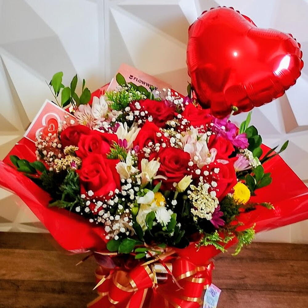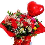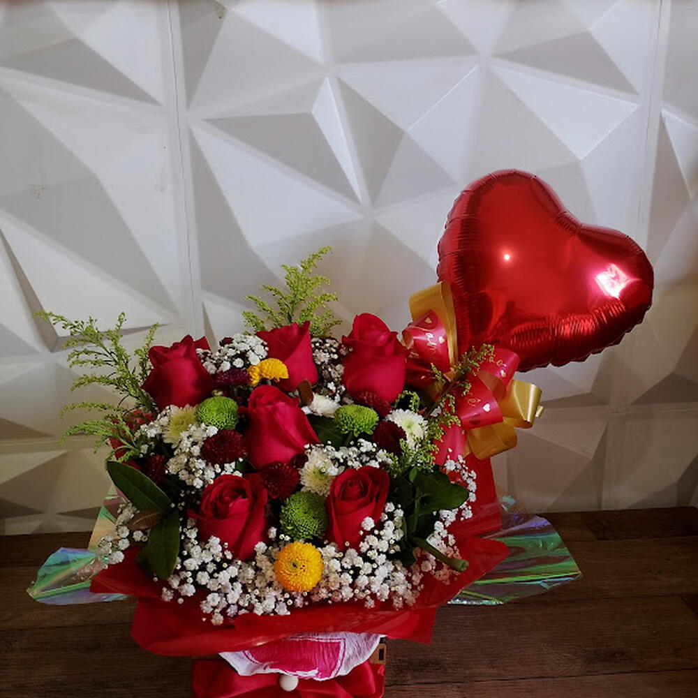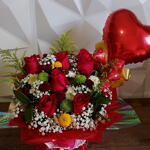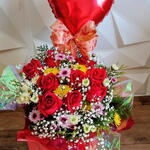 Um presente que transmite puro romantismo: um belíssimo buquê composto por rosas vermelhas exuberantes, acompanhadas de flores delicadas como gipsofila e pequenos crisântemos coloridos, que trazem um contraste encantador ao arranjo. A embalagem em tons de vermelho intenso reforça a paixão e o carinho presentes nesse mimo especial. Para completar o toque de amor, um balão em formato de coração acompanha o buquê, tornando-o perfeito para surpreender em ocasiões como aniversários, pedidos de namoro, declarações ou simplesmente para demonstrar afeto de maneira marcante e inesquecível.