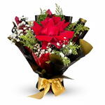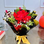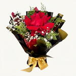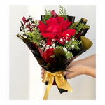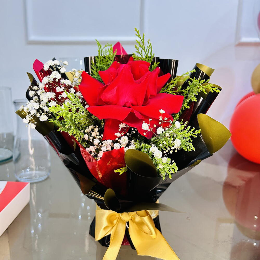 Este arranjo de flores única é composto por uma rosa vermelha luxuosa, acompanhada por uma seleção de folhagens complementares cuidadosamente selecionadas. Completo com embalagem charmosa e um laço elegante, é a escolha perfeita para expressar seu amor e apreciação em qualquer ocasião.
