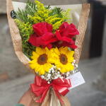 Desfrute do encanto do nosso Arranjo Dois Girassóis Duas Rosas, composto habilmente por dois girassóis vibrantes e duas rosas vermelhas sedutoras, embelezadas por folhagens frescas e gipsófila delicada. Embalado com carinho, este mine buquê exala elegância e sofisticação. A tonalidade da embalagem e dos laços pode variar, sempre mantendo a qualidade e o bom gosto, conforme a disponibilidade. Aprecie a beleza natural deste arranjo, perfeito para presentear e encantar em qualquer ocasião.