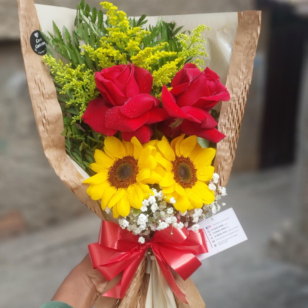 Desfrute do encanto do nosso Arranjo Dois Girassóis Duas Rosas, composto habilmente por dois girassóis vibrantes e duas rosas vermelhas sedutoras, embelezadas por folhagens frescas e gipsófila delicada. Embalado com carinho, este mine buquê exala elegância e sofisticação. A tonalidade da embalagem e dos laços pode variar, sempre mantendo a qualidade e o bom gosto, conforme a disponibilidade. Aprecie a beleza natural deste arranjo, perfeito para presentear e encantar em qualquer ocasião.
