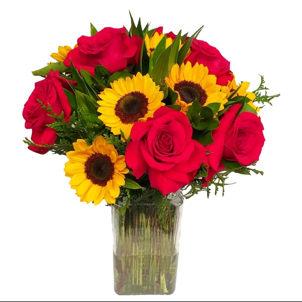 Este arranjo de flores em vaso é a expressão perfeita de charme e elegância. Composto por 8 girassóis vibrantes e radiantes, perfeitamente complementados por 8 rosas importadas de elegância sublime, tudo magistralmente disposto em um vaso de vidro de alta qualidade. Este arranjo de flores é um verdadeiro deleite para os olhos e certamente irá adicionar um toque de classe e sofisticação a qualquer ambiente. Ideal para presentear em ocasiões especiais ou simplesmente para embelezar a sua casa.