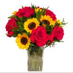 Arranjo de Rosas Vermelhas com Girassol na Base de Vidro