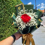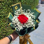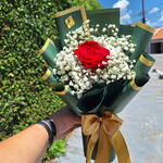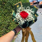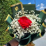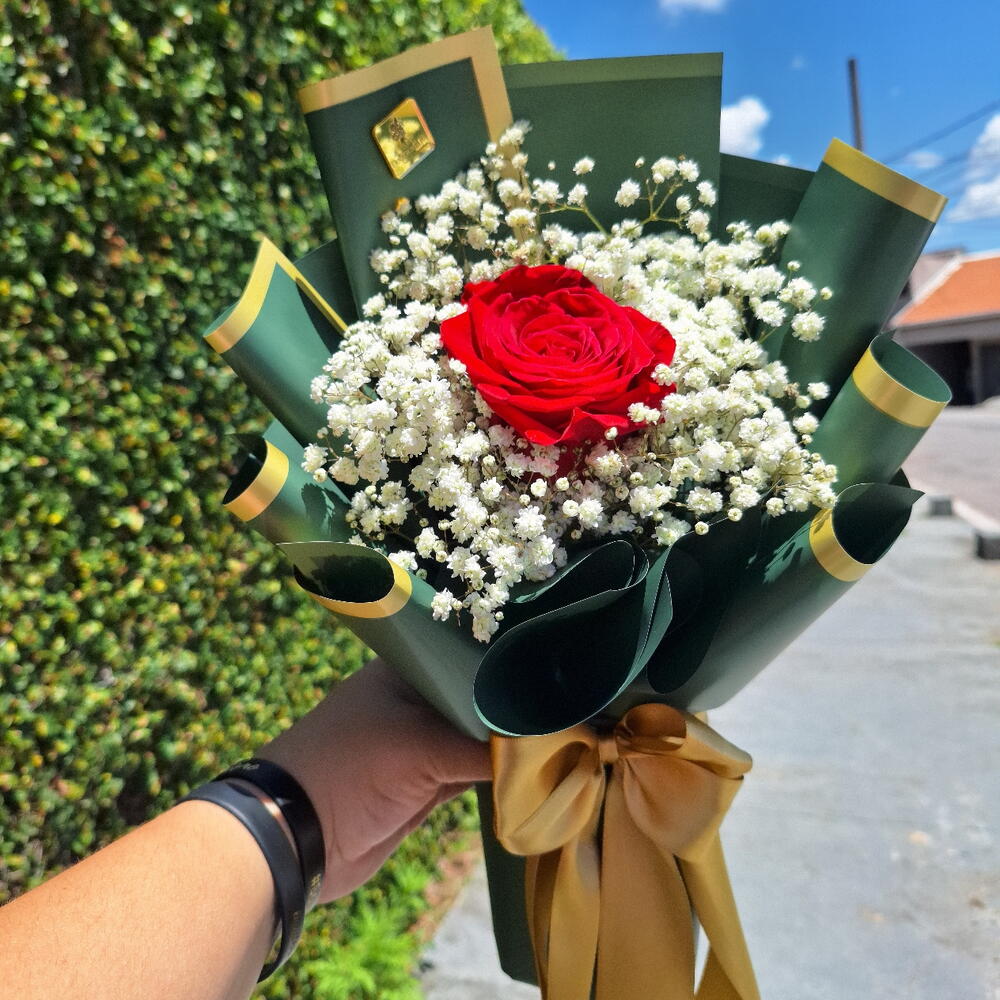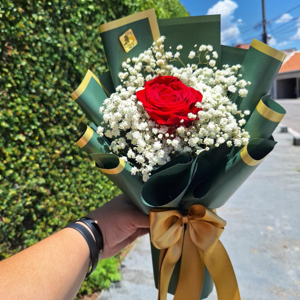 Arranjo Esmeralda composto por uma Rosa Colombiana e hastes de mosquitinhos . Finalizado com uma linda embalagem Coreana Embalagem de acordo com disponibilidade do estoque